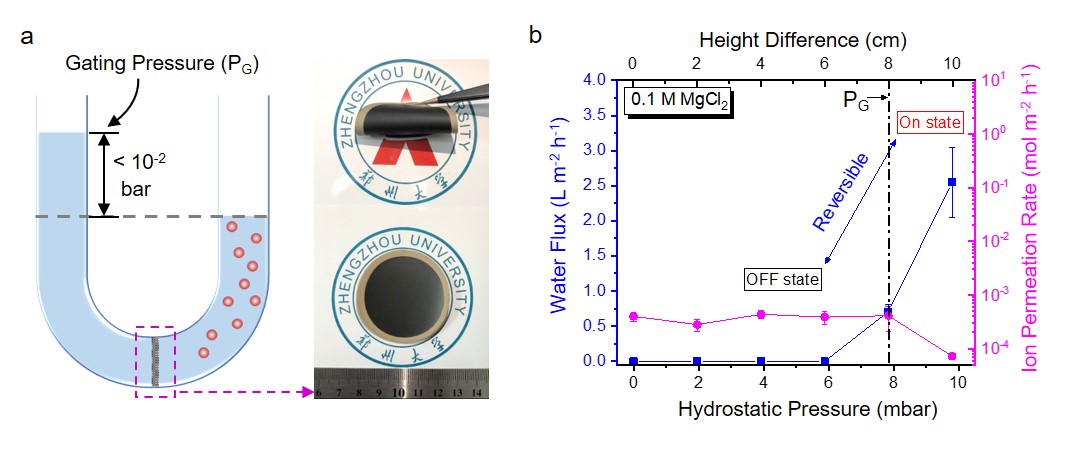 Fig. 2| Anomalous permeation through MOGMs. a Schematic of the experimental setup with inserted optical graphs of MOGMs. b Change of water flux and ion permeation rates with hydrostatic height differences in the centimeter range in the case of 0.1 M MgCl2 as the draw solution. The gating pressure is 7.8×10–3 bar (labelled as a dashed line). The reversible water on/off switch, ultrafast water flux, and effective ion sieving for Mg2+ ions are also illustrated. All the error bars in this figure represent the standard deviations for at least three measurements.