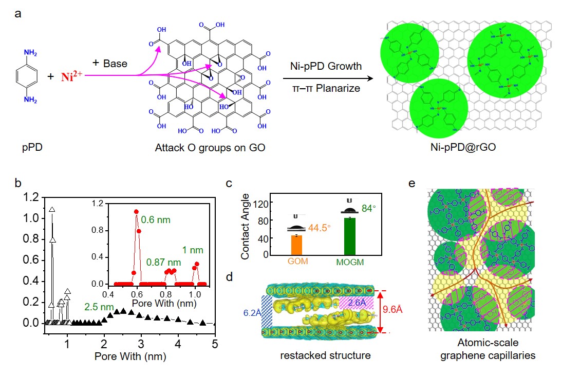 The challenge lies in fabricating NF membranes with atomic-scale graphene capillaries. Reduced graphene oxide (rGO)-based membranes are promising candidates, but they often face the issue ofrGO restacking, which seals the atomic-scale graphene capillaries. Therefore, we propose a redesign of the rGO structure by creating new heterostructures, known as graphitic nano-islands on rGO nanosheets, and utilizing the nano-islands as pillars to construct atomic-scale graphene capillaries in NF membranes. The key to success is controlling the atomic height of the nano-islands on rGO nanosheets. This goal has been successfully achieved by a catalytic reaction involving Ni ions, p-phenylenediamine (pPD), and oxygenated functional groups on graphene oxide (GO) nanosheets, resulting in the formation of Ni-pPD monolayer-islands distributed uniformly on rGO nanosheets (Fig. 1a). Upon restacking of these heterostructures, atomic-scale graphene capillaries were generated as confirmed by pore size distribution (PSD) analysis (Fig. 1b), which clearly demonstrates three sharp and distinctive peaks below 1 nm, with the strongest peak sitting at ~0.6 nm. The membranes made of the restacked Ni-pPD@rGO nanosheets have then been fabricated by vacuum filtration, followed by the controlled evaporation under external pressures. These membranes were denoted as metal-organic (Ni-pPD) pillared, graphene-based membranes (MOGMs). As consistent with previous reports, GO membranes (GOMs) contain hydrophilic capillaries and the contact angle obtained for GOMs is 44.5° (Fig. 1c). In contrast, the contact angle for MOGMs is 84°, indicating that MOGMs are full of atomic-scale graphene capillaries. The optimized structure computed by density-functional-theory (DFT) calculations (Fig. 1d) demonstrates that two monolayer islands of Ni-pPD are pillared between two rGO through π-π stacking, generating the free space of 2.6 Å and 6.2 Å. Therefore, unlike activated graphene/carbons that normally have a continuous size distribution of micropores, the pore structure in MOGMs resembles the structural characteristics of molecular sieves with the pathways to conduct water molecules illustrated in Fig. 1e, manifesting the delicacy of this synthesis strategy.