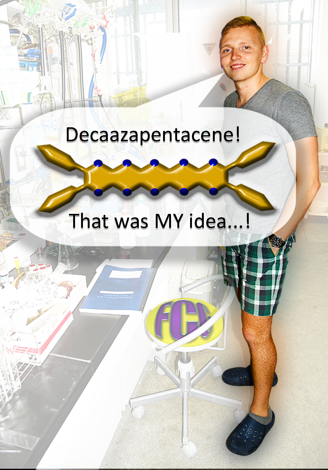 Subsequently, some time ago, the then postgraduate student David Miklík (See Fig. 1) appeared in my laboratory in Tsukuba on a visiting studentship from the group of Prof. Filip Bureš at the University of Pardubice. He was accompanied by Pavel Švec, another chemist from the Czech Academy of Sciences. David and Pavel both confessed to being organic chemists and so, I assigned them a general project of preparing new pyrazinacene molecules for the investigation of their fluorescence properties with a view to developing materials for sensing or energy applications. For this purpose, they commenced a literature review and we discussed possible synthetic targets. Pavel ended up working on a one-pot synthesis of an octaazapentacene (OAP) derivative whose preparation we had come across earlier. That work has since been published including details about the tautomerization and unusual N-alkylation on the pyrazinacene backbone. After considering the literature, David and I finally arrived at what seemed at the time to be an obvious interrogative: “Why on earth has no-one synthesized 1,4,5,6,7,8,11,12,13,14-decaazapentacene?” The compound (abbv. DAP) had been mentioned in a seminal work by Michael Winkler and Kendall Houk, which suggested that DAP, and other N-heteroacenes, should be n-type semiconductor complements to the already well-known p-type acenes, like pentacene. Thence, we commenced to devise a synthesis of DAP and started at nucleophilic substitution of electron deficient 1,2-phthalonitriles. Trial and error revealed that reactions proceeded much better using chloride as leaving group and, after further lab activity, David had prepared both highly nitrogenous acene derivatives 1,4,5,6,9,10,11-octaazatetraacene and DAP. Our experience of the synthesis led us to include end-capping phenyl groups to improve solubility and to facilitate NMR analyses, and the final products were isolated as their dihydro derivatives (just as pentacene is sensitive to oxidation, the electron deficient DAP and congeners are unstable in their oxidized states).
