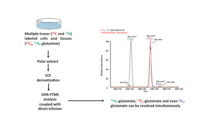 This requires either NMR, which is often not sufficiently sensitive, or mass spectrometry (MS). Many MS platforms cannot resolve a molecule containing 1 13C, 1 15N or 1 2H atom, which differ from the more common lighter isotope by one neutron. However, adding a neutron to a nucleus does not increase the mass by exactly that of the neutron rest mass, and the mass difference due to the binding energy is isotope specific; ultrahigh resolution MS can resolve these very small isotopic mass differences routinely, and with very high sensitivity.