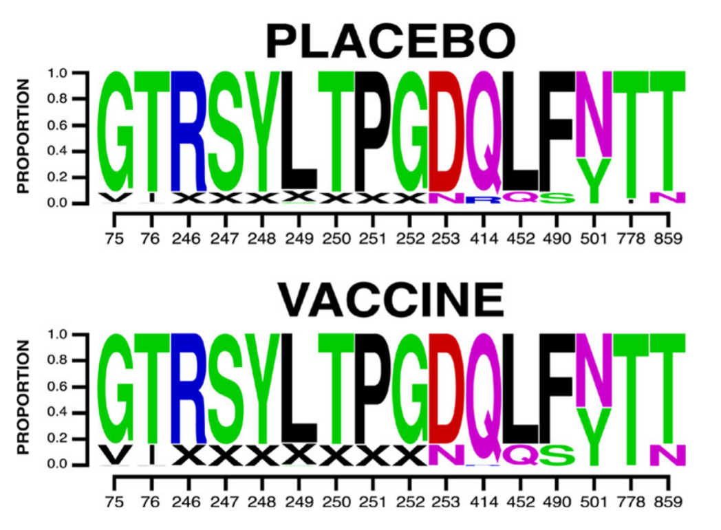 In this trial, of the 1,545 participants who were diagnosed with COVID, we were able to sequence full genomes of the SARS-CoV-2 virus from 1,224 of them (378 vaccine recipients, 846 placebo recipients). From these, we compared the Spike proteins (as amino acid sequences) between those participants who received the vaccine and those who received the placebo. This type of analysis is referred to as a “sieve analysis”: the vaccine serves as a metaphorical kitchen sieve, preventing some viruses from establishing a symptomatic infection, while others manage to sneak through. Because this was a randomized trial, the results of such an analysis can be interpreted as how vaccine made an impact on the genetic composition of the infecting viruses.