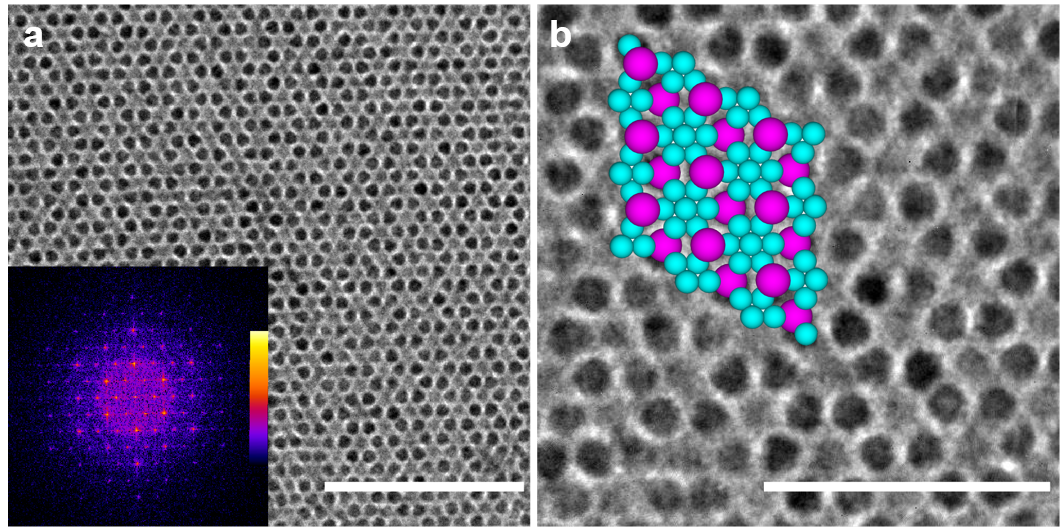 Fig. 1 Self-assembled BNSLs in bulk. BNSL composed of CdSe and PbSe NCs showing a MgZn2-like structure viewed along the [0001] projection at different magnifications. The hexagonal symmetry can be visualized from a false colored Fourier transform (inset of a) with a MgZn2 structure model (overlay in b) viewed along the [0001] projection. Scale bars, 100 nm (a) and 50 nm (b) .