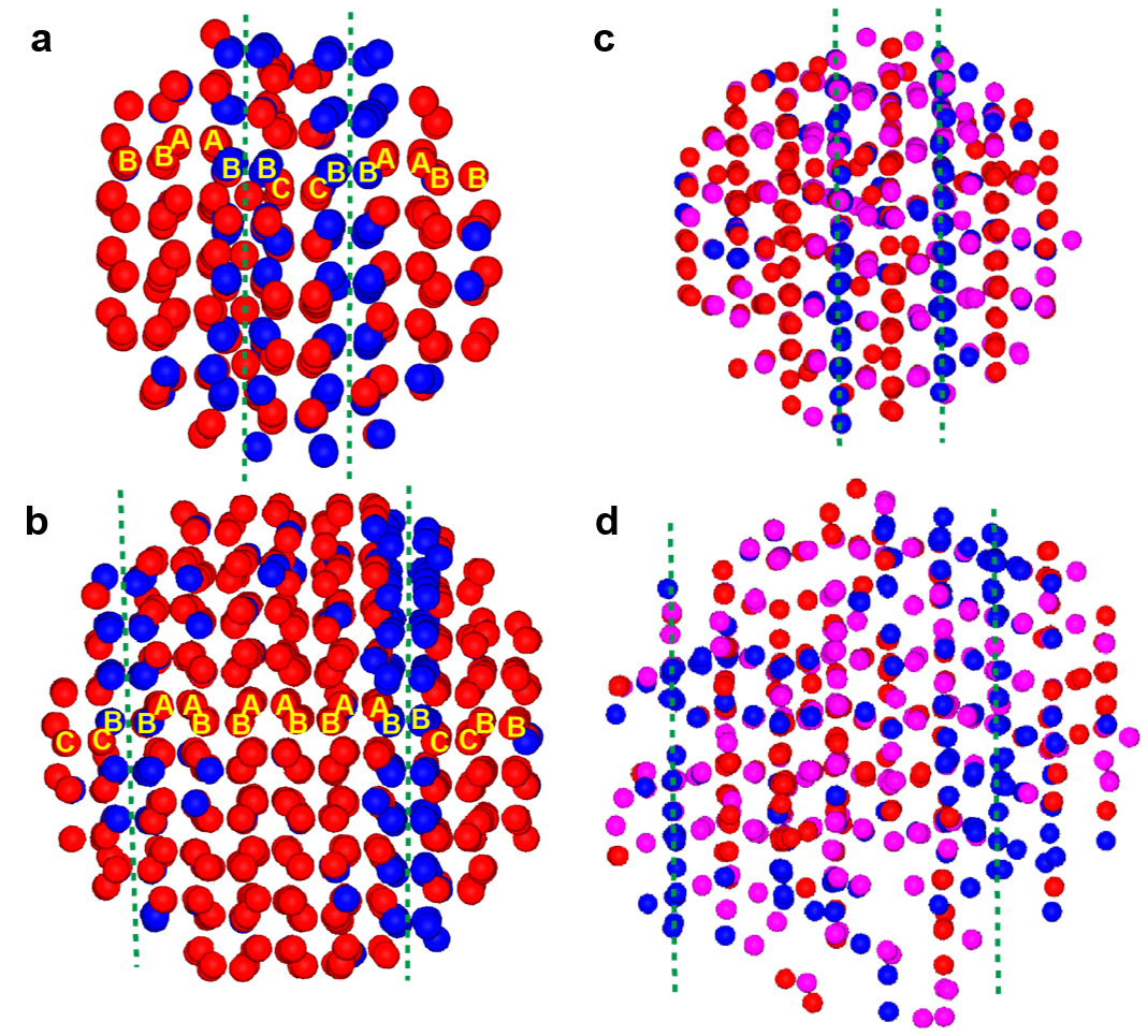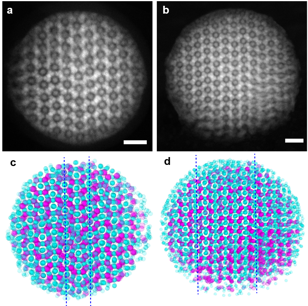 Fig. 2 Self-assembled binary Laves SPs. 2D HAADF-STEM projections of (a) a 115 nm-sized SP, (b) a 150 nm-sized SP, 3D reconstruction renderings of the (c) 115 nm and (d) 150 nm SPs. Stacking faults in the two SPs are marked with dark blue dashed lines. Scale bars, 20 nm.