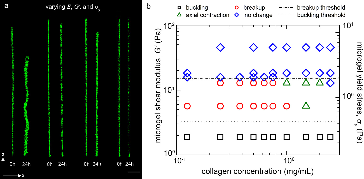 To investigate these complex phenomena, Angelini, Morley, and Ellison assembled a team of UF chemists (Kabb and Summerlin), mechanical engineers (Bhattacharjee, O’Bryan, Schulze, Niemi, Zhang, Smith, and Sawyer), and cell biologists (Sebastian, Moore, Tran, Mitchell, and Flores) to develop a platform consisting of collagen-cell beams embedded within a jammed microgel support. Each domain has independently controllable mechanical properties, which enabled them to observe that cells react to their integrated mechanical environment. By varying the properties of either the beams, the microgel environment, or both, they can encode cell-mediated beam buckling, beam failure, or beam contraction, as well as conditions in which the beams remain unchanged (Figure 1). Notably, these structural changes were observed for different cell types, suggesting that they are a general property of collagen, not the cells. Further, the beams respond to cell-generated forces in accordance with classical macro-scale models of structural elements, such as steel, enabling sophisticated, user-defined control of the resulting shape change.