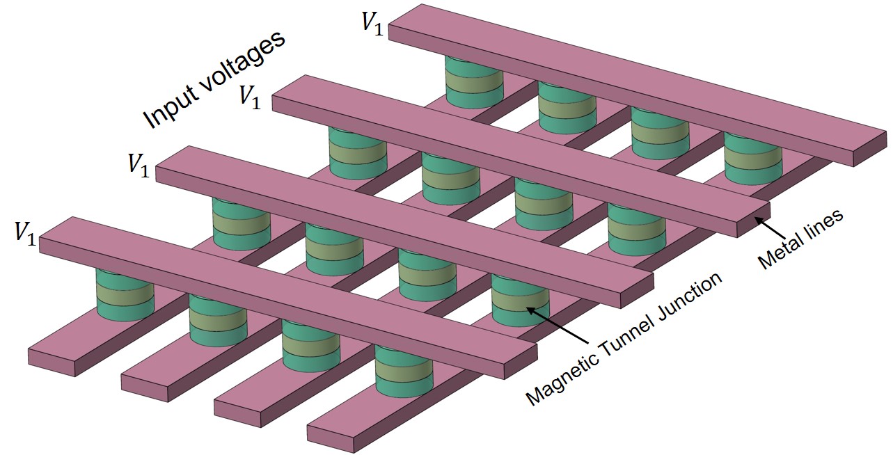 MTJ crossbar array. A crossbar architecture for highly scalable nanomagnets array realized via magnetic tunnel junctions (MTJs).