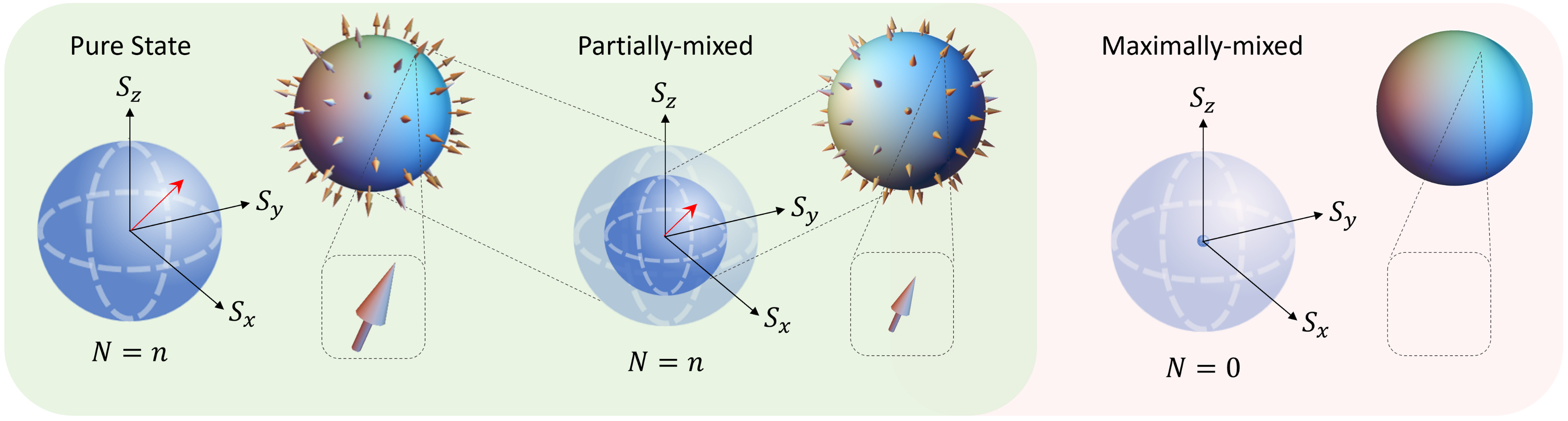 Figure 3: The effect of isotropic noise on the state. In the absence of noise, a pure state is represented by a sphere of unit radius. In the presence of noise, the state becomes partially mixed represented by a sphere with a radius < 1 and if noise dominates the system, the state is maximally mixed represented by a point with zero radius.