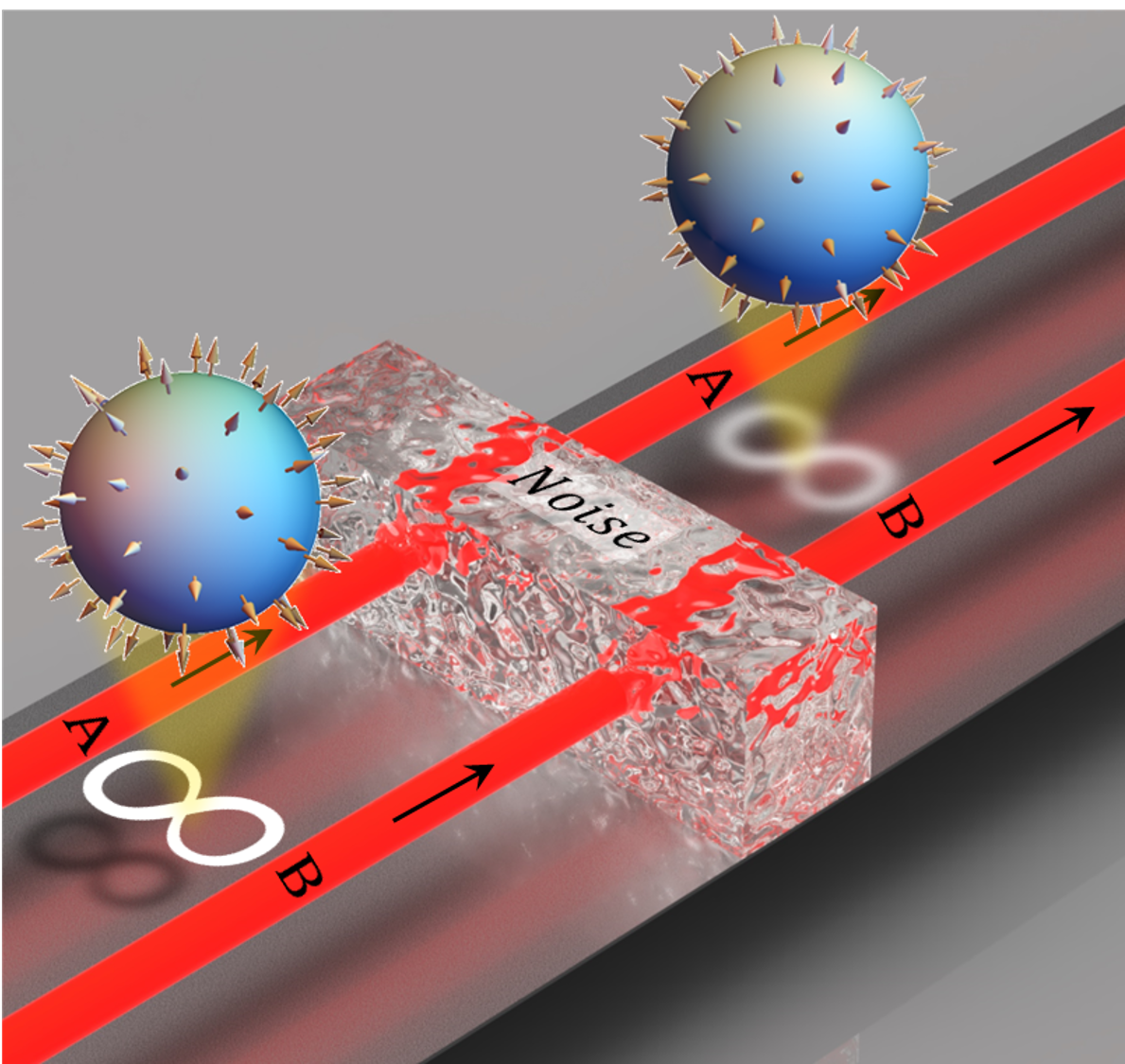 Figure 1: Conceptualization of a quantum state, consisting of a pair of entangled photons, passing through a noisy channel. While the entangled state degrades after passing through the noise the topology of the state is left unperturbed.