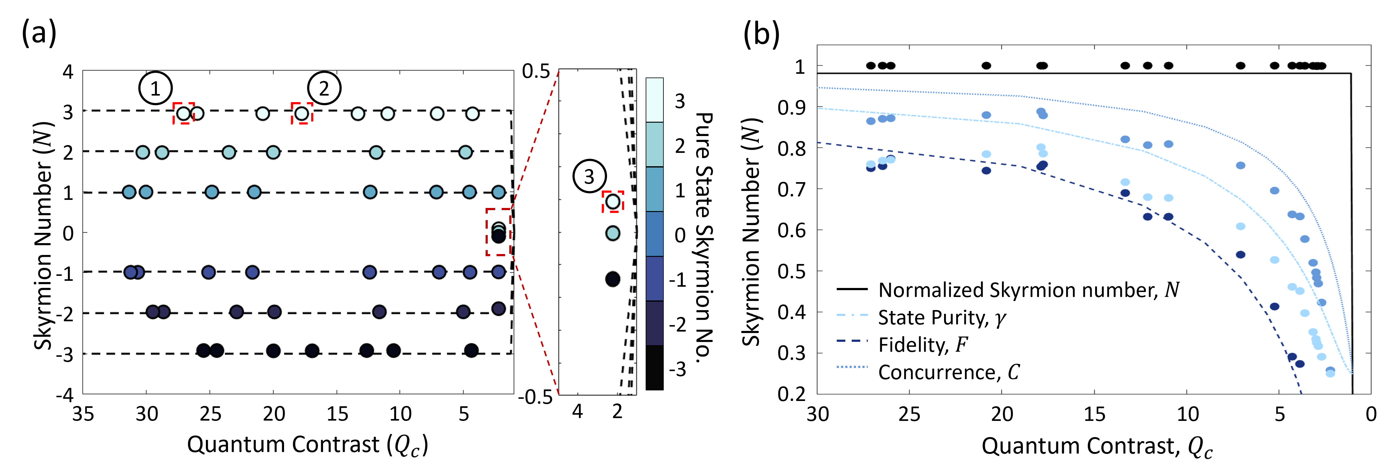 Figure 2: (a) The invariance of the quantum Skyrmion number for states of varying orders against the signal-to-noise ratio measured by the quantum contrast. (b) The state decay characterized by a decline in the usual entanglement measures of the state.