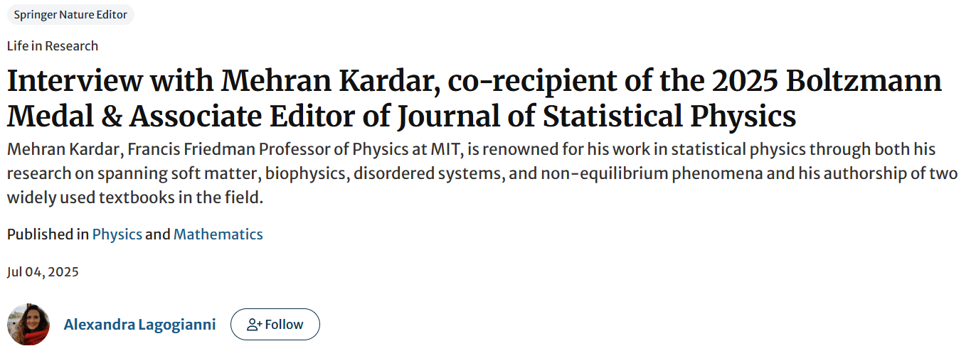 In this interview shared by @Alexandra Lagogianni, Mehran Kardar, co-recipient of the 2025 Boltzmann Medal and Associate Editor of Journal of Statistical Physics, shares his journey from Tehran to MIT and reflects on a career exploring complex systems. He discusses the impact of the Kardar-Parisi-Zhang equation, his work in polymers, biophysics, active matter, and how collaborations with students and colleagues shaped his research.