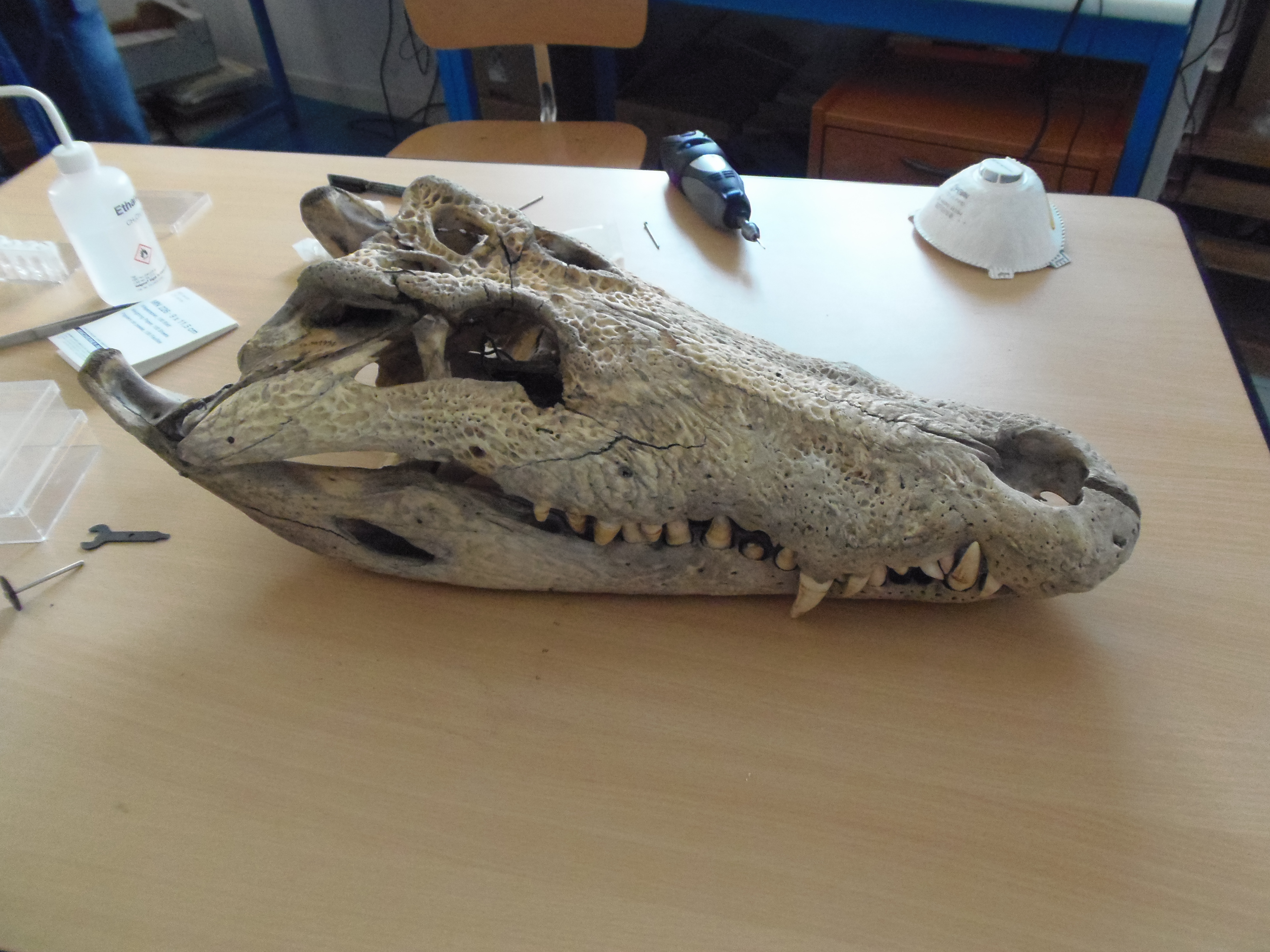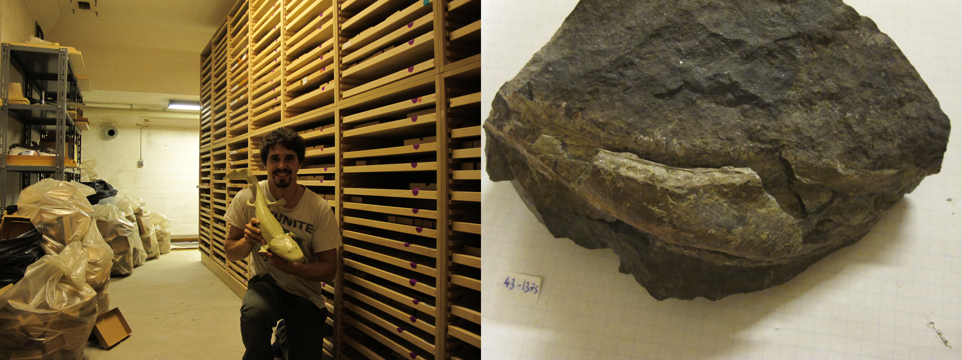 The next episodes was to collect some fossils representing those early tetrapods and their associated fauna. One of the most important collection of those fossils is held in the collections of the Museum of Geology of Copenhagen. Pr. Gilles Cuny, who was the ancient curator of those collections, was just recruited as a professor in the Laboratory of geology of Lyon… and his office was assigned just next of mine! Taking advantage of this fortunate coincidence, I came to Copenhagen with him. And here I am (Photo 3), in the collection of the Museum of Geology of Copenhagen, surrounded by the fossils of those Devonian vertebrates. Among them some placoderms, dipnoans and early tetrapods. Let’s collect some bone powders using the Dremel® system!