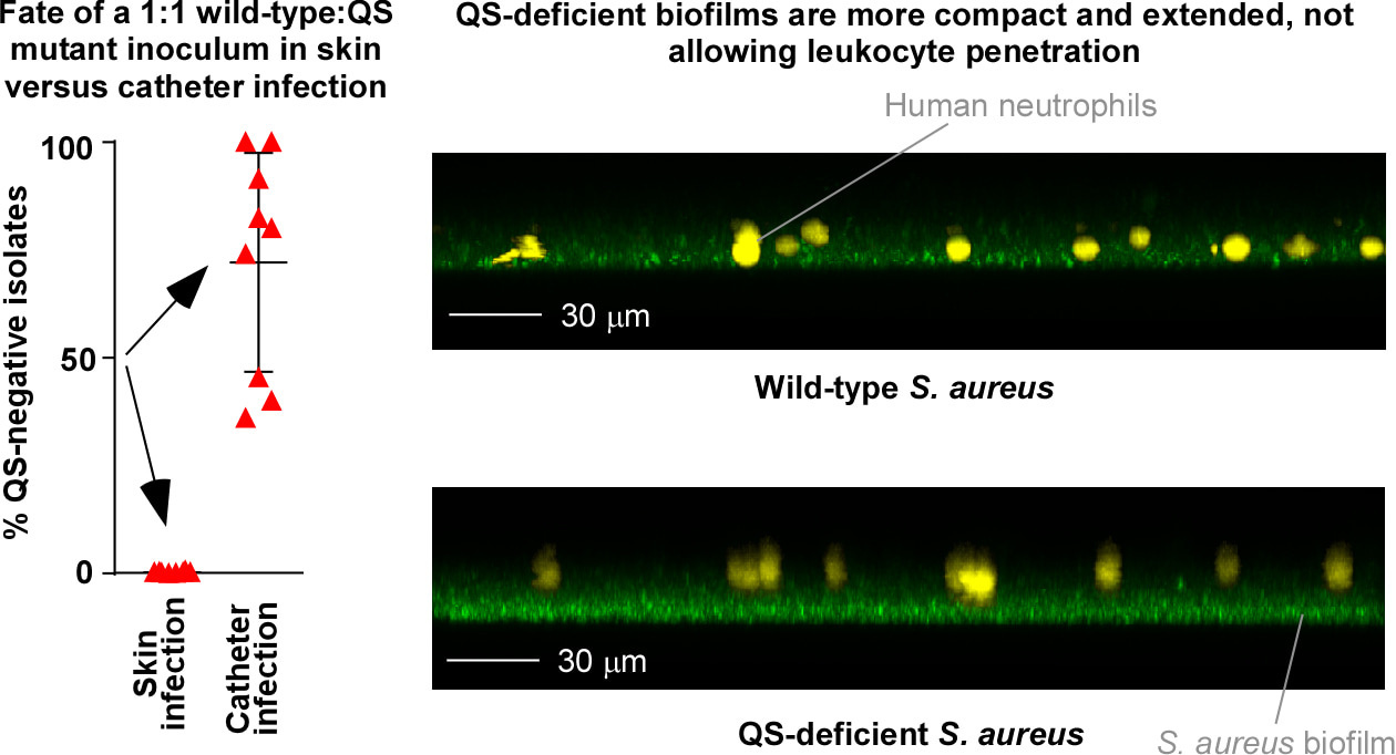 The second question is related to the clinical observation that quorum-sensing mutants can often be isolated specifically from biofilm-associated chronic infection. This has not yet been explained mechanistically and prompted us to investigate quorum cheating duringS. aureusinfection. Strikingly, in non-biofilm (skin) infection, we never detected quorum cheaters and found that QS-negative strains have a dramatic disadvantage – which is easily explained by the QS-controlled toxins that S. aureusneeds for survival under those conditions. In biofilm (catheter-associated) infection, however, the picture was different. In that scenario, we detected quorum cheaters and found that they have a selective advantage. Ex-vivo investigation of S. aureusbiofilm-leucocyte interaction as well as in-vivo experiments using leukocyte-depleted mice explained this by increased resistance of the characteristically more extended and compact QS-negative biofilms toward leukocyte attacks, which evidently under those conditions overrides the advantages of toxin production.