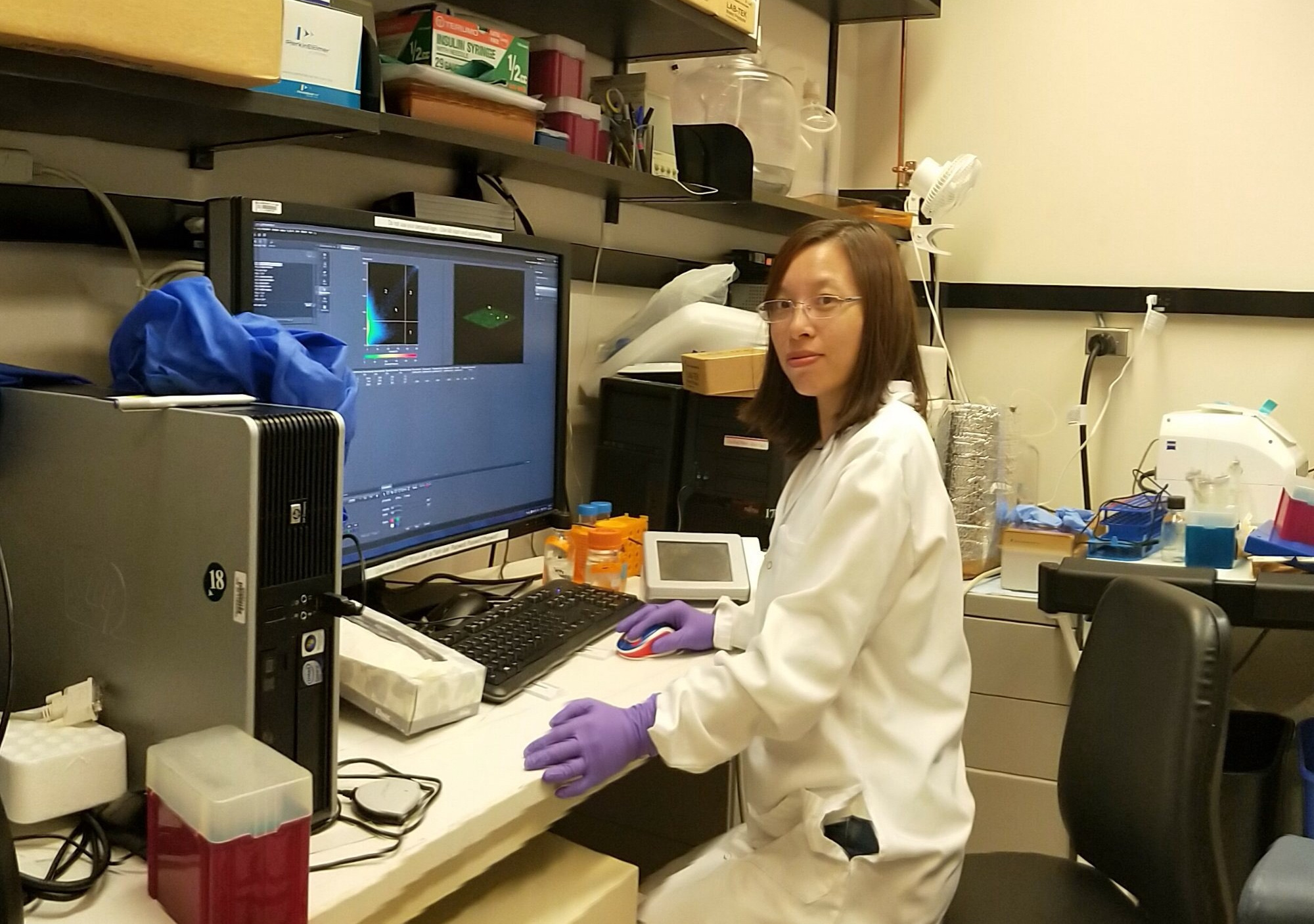 The first author of the study, Dr. Lei He, evaluating confocal microscopy data