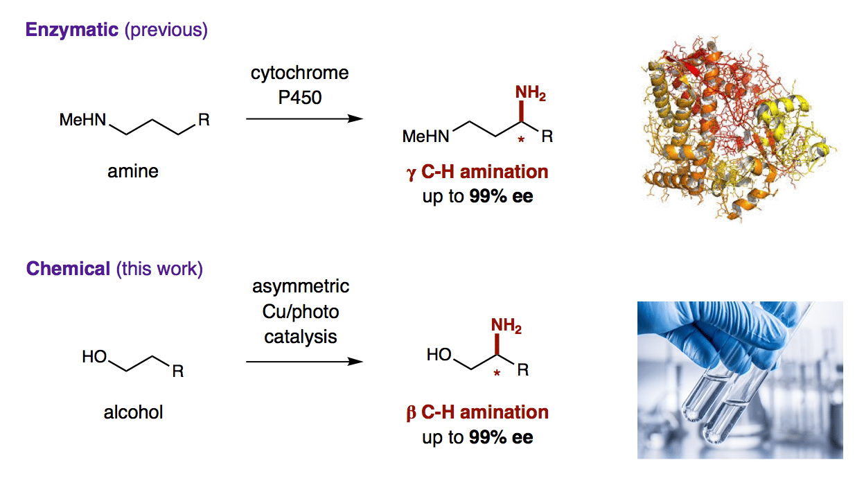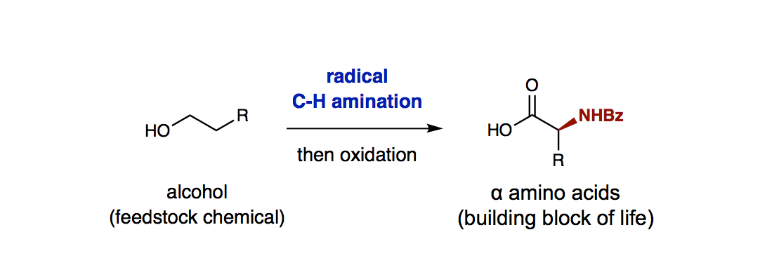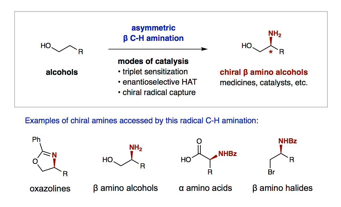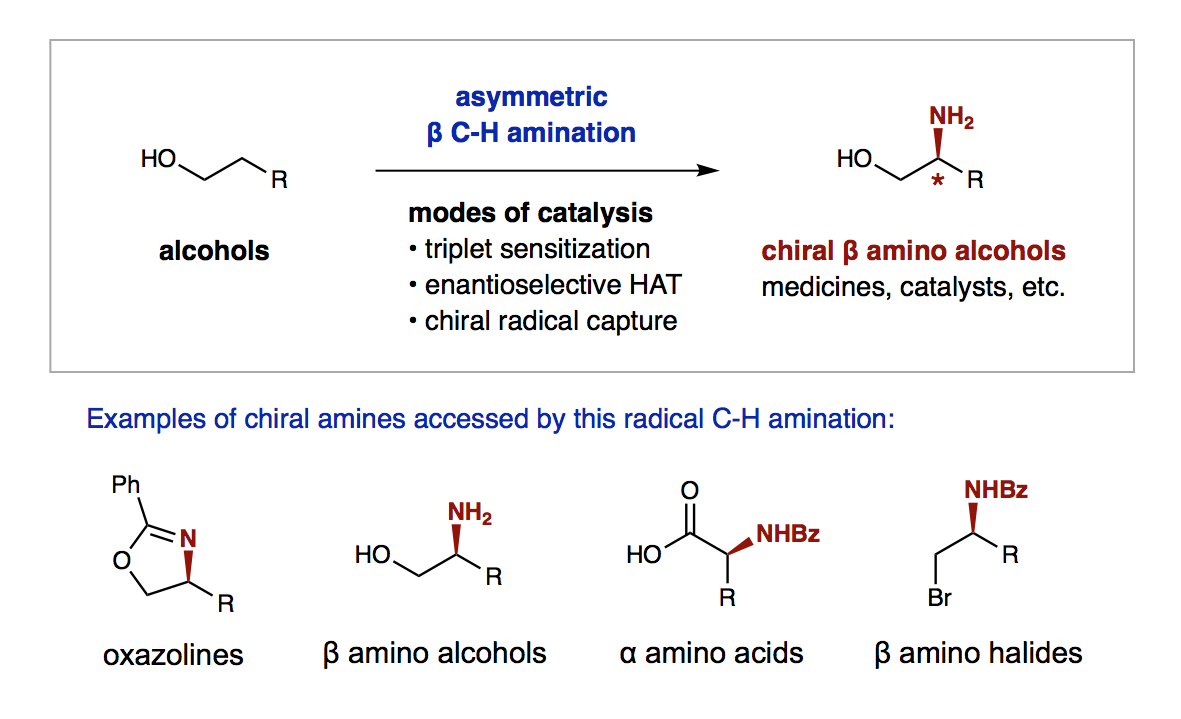 The synthetic value of this strategy, which enables selective access to a family of chiral amines (including amino acids, the building blocks of life) from simple alcohols, will likely be its many applications in medicinal chemistry. Interestingly, this method also provides a snapshot of the state-of-the-art in chemical synthesis - and especially, asymmetric C-H amination. For example, Frances Arnold and coworkers recently reported enzyme catalysts (derived from a cytochrome P411) may enable enantioselective nitrene-mediated γ C-H amination of amines. In comparison to this enzymatic approach, our chemical approach now affords highly enantioselective β C-H amination of alcohols. The approaches are complementary in mechanism, reactivity, and field of catalysis. Importantly, both strategies offer important new tools in creating privileged motifs from simple feedstock chemicals.