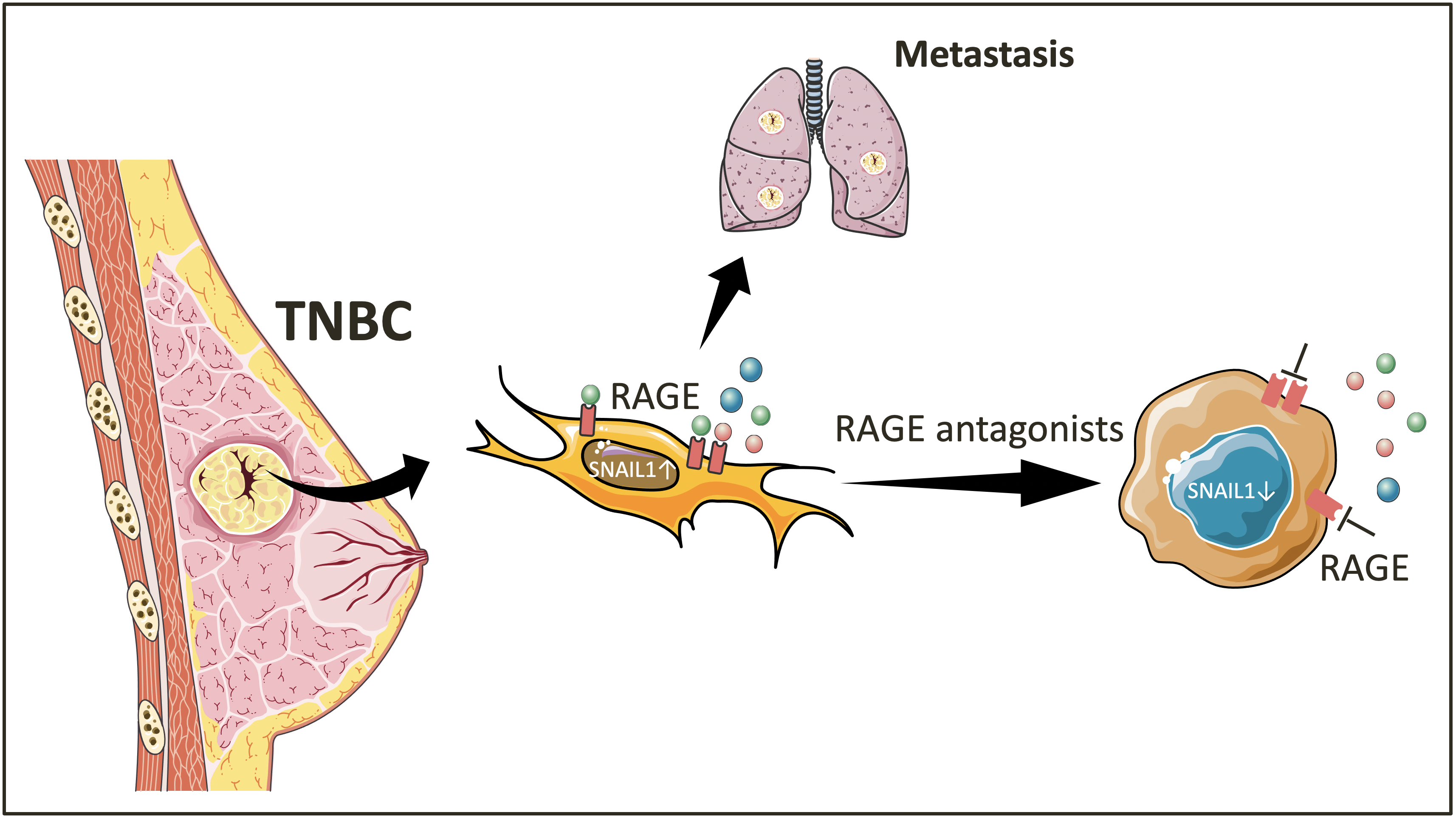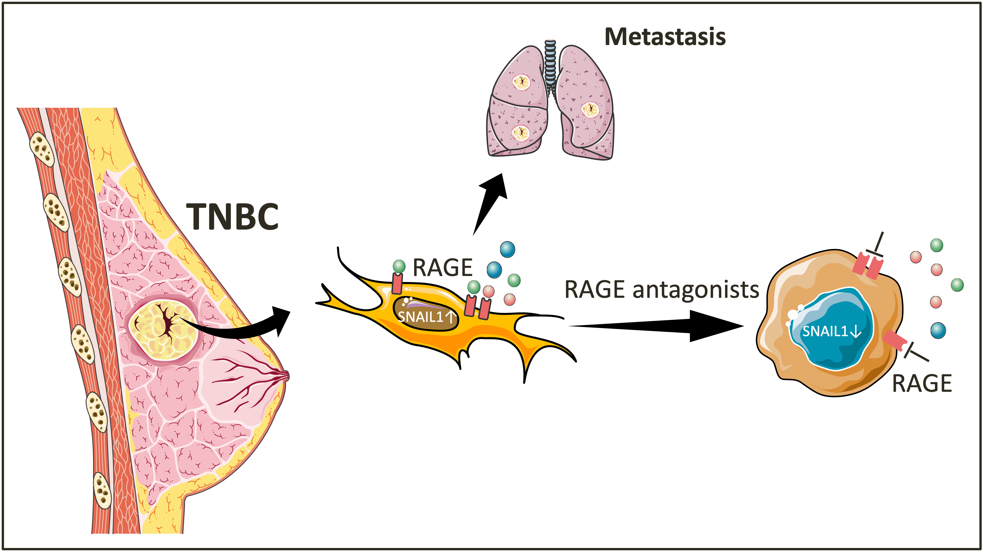 A few years ago, careful analysis of TNBC secretomes generated in our lab revealed the existence of several theoretically intracellular proteins. During these studies, we showed that an alternative extracellular function of the nuclear protein HMGA1 mediates tumor invasion and metastasis in triple-negative breast cancer (TNBC) by becoming a ligand for the Receptor for Advanced Glycation End-product (RAGE). Upon these results, we decided to characterize the role of RAGE in TNBC. The main highlights of our work are: