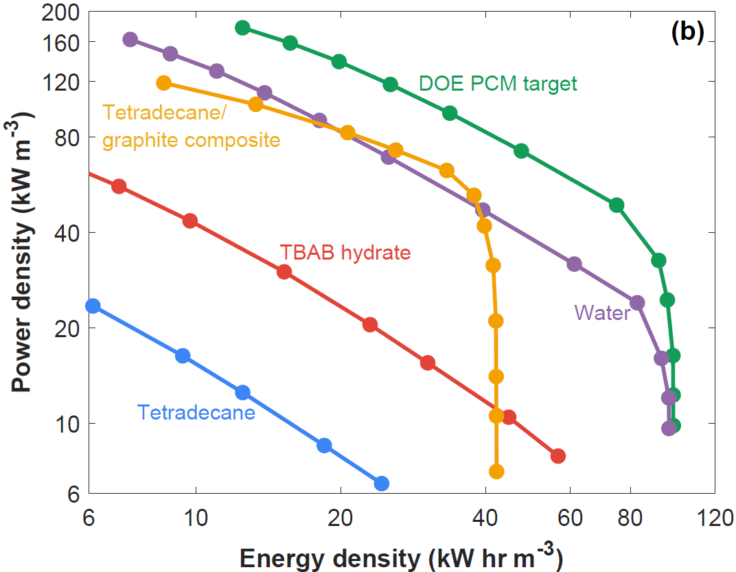 There is considerable research worldwide on thermal energy storage, often looking at phase change materials with their large enthalpy of fusion. When a material changes from a solid to a liquid, it absorbs a lot of energy, which can be used for cooling. Likewise, liquid-to-solid phase change releases energy, which can be used for heating. Thousands of publications exist on new phase change materials for these applications, with many of them focused on increasing the power capability of these materials due to their low thermal conductivity. However, there is no clear guidance on what level of enhancement is needed or how power is related to the accessible storage capacity in thermal storage devices.