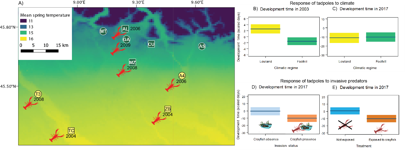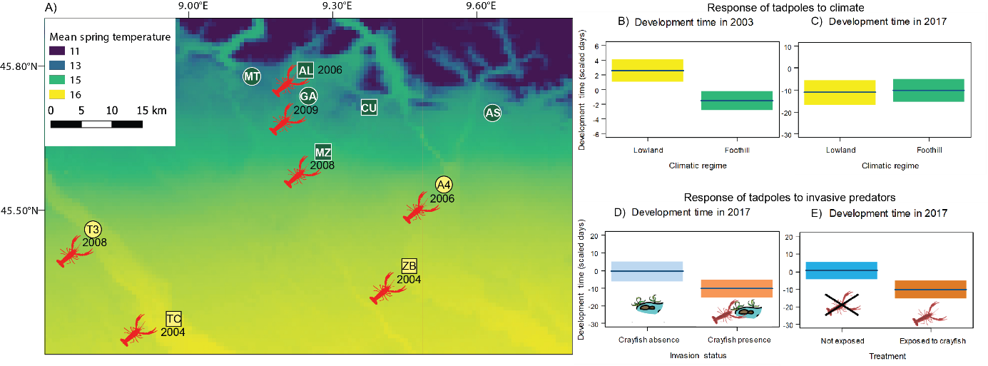 In 2017, we collected again egg-clutches from the populations sampled in 2003, many of which are now invaded by the crayfish. We repeated the experiment of 2003, with additional replication levels to test whether frogs show constitutive or plastic responses to the crayfish. Tadpoles from invaded populations showed a much faster development than those from non-invaded populations, reaching metamorphosis 10 days earlier. This suggests that the crayfish promoted the rapid evolution of fast development that limits tadpole exposure to predators. Conversely, differences between lowland and foothill populations disappeared. The new invasive predator become a dominant selective pressure for these frogs, and rapidly overwhelmed the role of climatic gradients in shaping development rate. This ontogenetic shift came at a cost, as after metamorphosis fast developing froglets had small size and poor jumping performance, even though compensatory growth counterbalanced these carry-over effects.