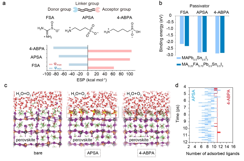 Figure 1 Design of passivators. a, Molecular structures of three passivator molecules (FSA, APSA and 4-ABPA). Gaussian calculated electrostatic potentials (φ, ESP) values of maximum ESP (φmax) and minimum ESP (φmin) are also shown. b, Binding energy of three molecules with the AI-terminated (001) surface of MAPb0.5Sn0.5I3 and MA0.25FA0.75Pb0.5Sn0.5I3. c, ab initio molecular dynamics (AIMD) snapshots of bare, APSA, and 4-ABPA adsorbed perovskite surface exposure to oxygen and moisture conditions at a temperature of 400K. The perovskite composition is MA0.25FA0.75Pb0.5Sn0.5I3. P atoms, lavender color; S atoms, yellow color; O atoms, red color; Pb atoms, grey color; Sn atoms, orange color; I atoms, purple color; N atoms, green color. d, The number of adsorbed ligands for APSA and 4-ABPA at the conditions shown in Fig. 3c from 4ps to 12ps during the AIMD simulation. Ligand number of 16 represents complete surface coverage within the simulation unit. Blue line: APSA adsorption case; Red line: 4-ABPA adsorption case. The average value of adsorbed ligands during the last 2ps of the AIMD simulation for APSA and 4-ABPA are 8 and 11, respectively.