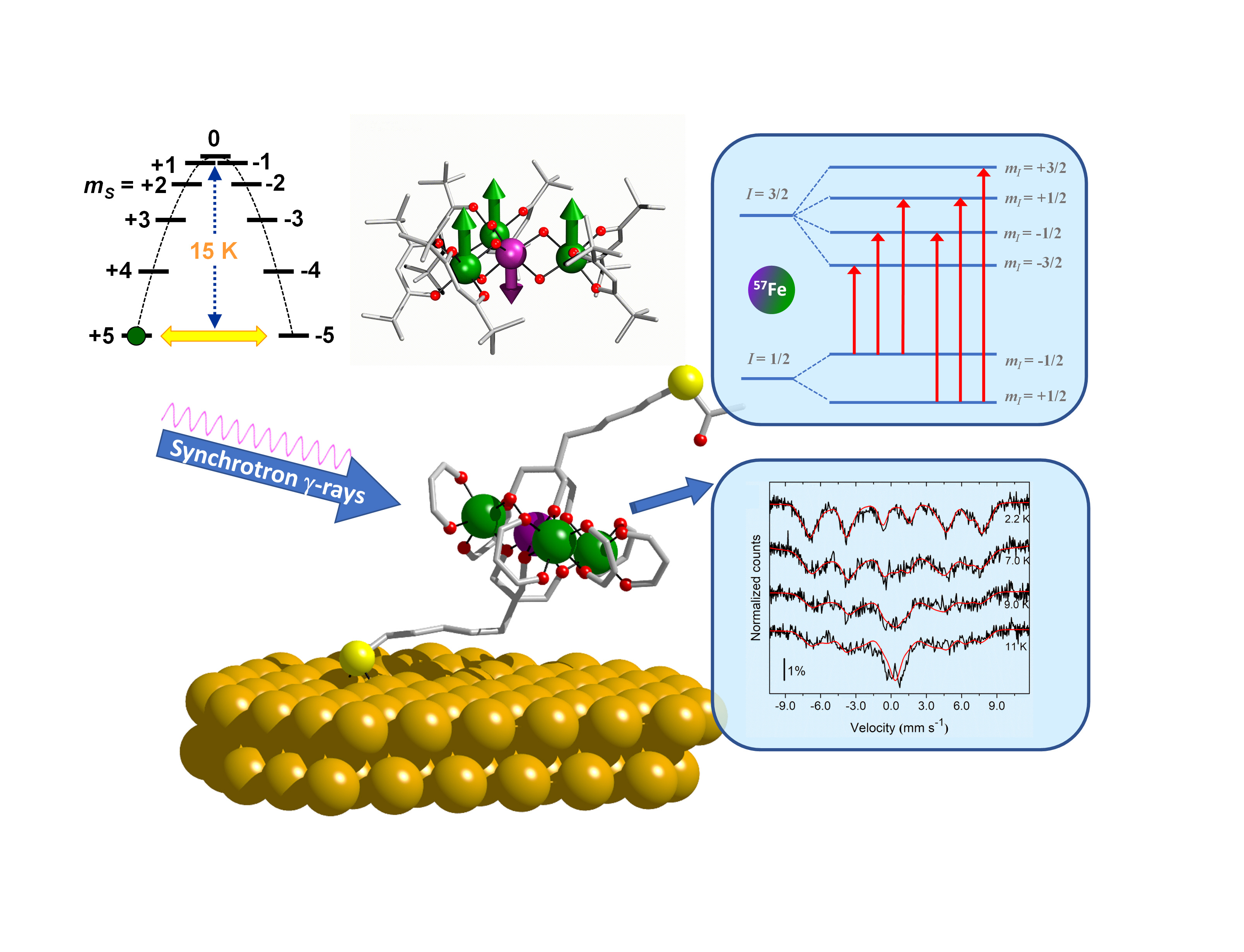 Andrea Cornia: Interfaces are not only important channels through which materials communicate with their surroundings and display their functionality. These thin portions of matter may also give rise to totally unforeseen behaviors, like ferromagnetism in otherwise diamagnetic metals.1 The exciting opportunity of engineering and controlling interfaces, however, comes at the cost of adapting investigation techniques to a new target: probing minuscule amounts of materials. Especially difficult to detect are the magnetic properties of soft molecules arranged on a metal surface as a single layer in a spintronic device. After our joint labs started to delve into the subject in 2000, it took almost a decade (and an untold number of sleepless nights at synchrotron light sources) to properly sharpen our working methods and fully exploit the exceptional surface sensitivity of X-ray magnetic circular dichroism (XMCD).2 In retrospect, the result was inspiring and definitely worth the effort: molecules with a directionally bistable magnetic moment maintain their memory effect when sitting on a metal surface. The XMCD technique suffers however from a major drawback: due to the finite rate at which magnetic fields can be swept and X-ray polarization switched, spin dynamics timescales shorter than about 100 s are impossible to follow. When dealing with the tetrairon molecules (Fe4) we synthesize in Modena, the only way out is freezing the sample down to prohibitively low temperatures. To tell the truth, accessing much shorter timescales (1-1000 ns) was not the only reason why we started thinking to Mössbauer spectroscopy as an alternative technique.