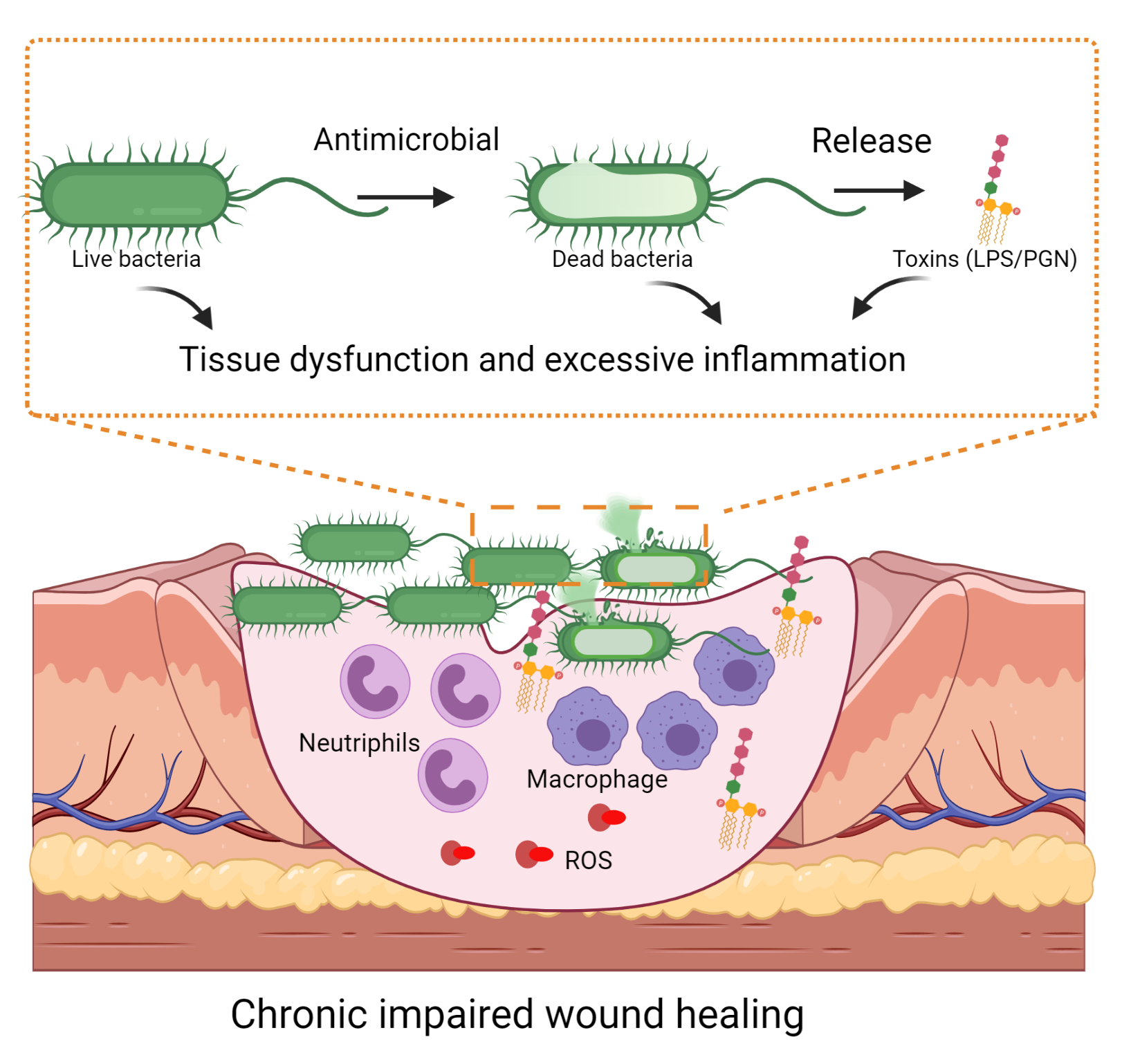 Impaired wound healing is a growing global concern driven by aging populations and the increasing prevalence of chronic conditions, such as diabetes and obesity. Infection is a major factor that delays wound healing, which can lead to sepsis and multiorgan failure, and even cause death in severe cases1, 2. Currently, antimicrobials such as antibiotics are used to treat infected wounds, however, the dead bacteria accumulating at the site of infection could induce undesirable tissue inflammation3, 4. The dead bacteria can release massive amounts of toxins (Lipopolysaccharide(LPS) in Gram-negative bacteria) and ( Peptidoglycan (PGN) in Gram-positive bacteria) that can activate immune cells to induce excessive inflammation and toxicity, leading to chronic and impaired wound healing5-8 (Figure 1). Therefore, developing strategies to simultaneously inhibit the survival of live bacteria and dead bacteria-induced excessive inflammation to heal infected wounds is urgently needed.