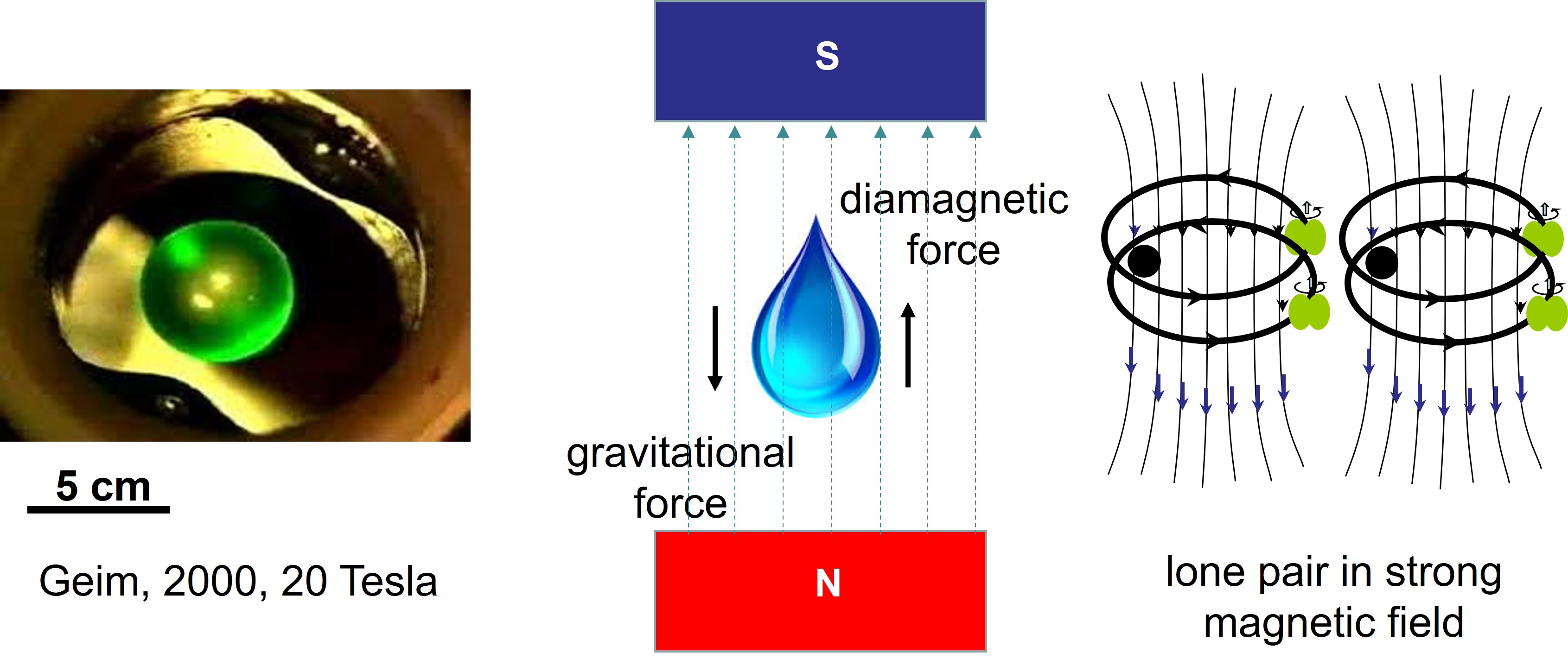 Normally, lone pairs of electrons in a water molecule are not magnetic because they have 360° of freedom along the long axis of their elliptical orbits. Electron spin perpendicular to the orbit represents the lowest energy state. A strong magnetic field forces electrons to align their spins along the direction of the external magnetic field, causing all lone pairs of electrons to point in the same direction. Due to the dense packing of the orbits, the superimposed magnetic field (as shown in Figure 2) exhibits strong diamagnetism.