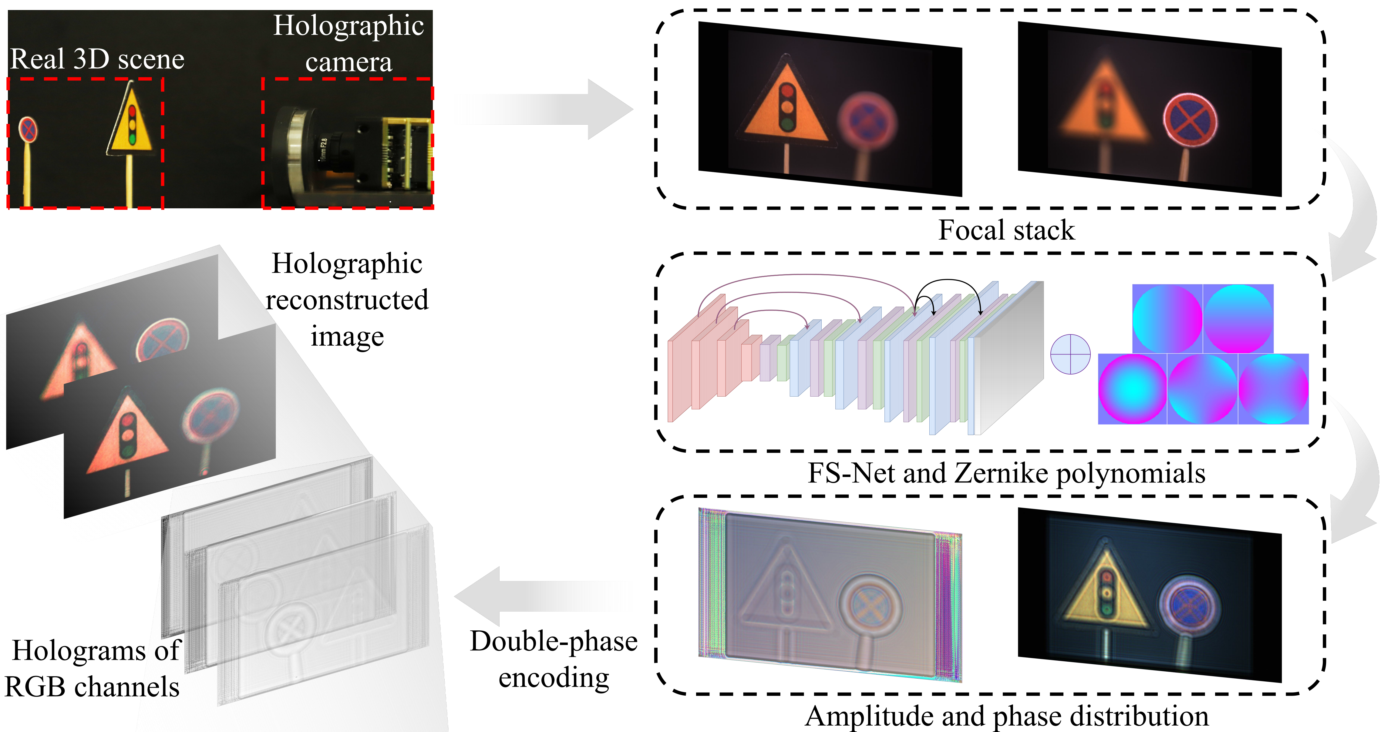 In this work, a holographic camera for real-time acquisition and real-time hologram generation of the real 3D scene is proposed. Figure 1 shows the concept of the holographic camera. At the acquisition end, a liquid camera based on the elastic membrane liquid lens is designed, which can take a fast zoom within 15 ms driven by a voice coil motor. At the calculation end, a real-time hologram generation method based on the focus stack network (FS-Net) is proposed. To solve the problem that the blur of the holographic reconstructed image does not match the blur of the real 3D scene, an aberration compensation method based on Zernike phase is used in the FS-Net. The time for the FS-Net to calculate the hologram is only 13 ms after the focus stack captured by the liquid camera is fed into the FS-Net. With the proposed holographic camera, the peak signal-to-noise ratio of the holographic reconstructed image can reach 40 dB, and the time from scene capture to holographic display is only 28 ms.