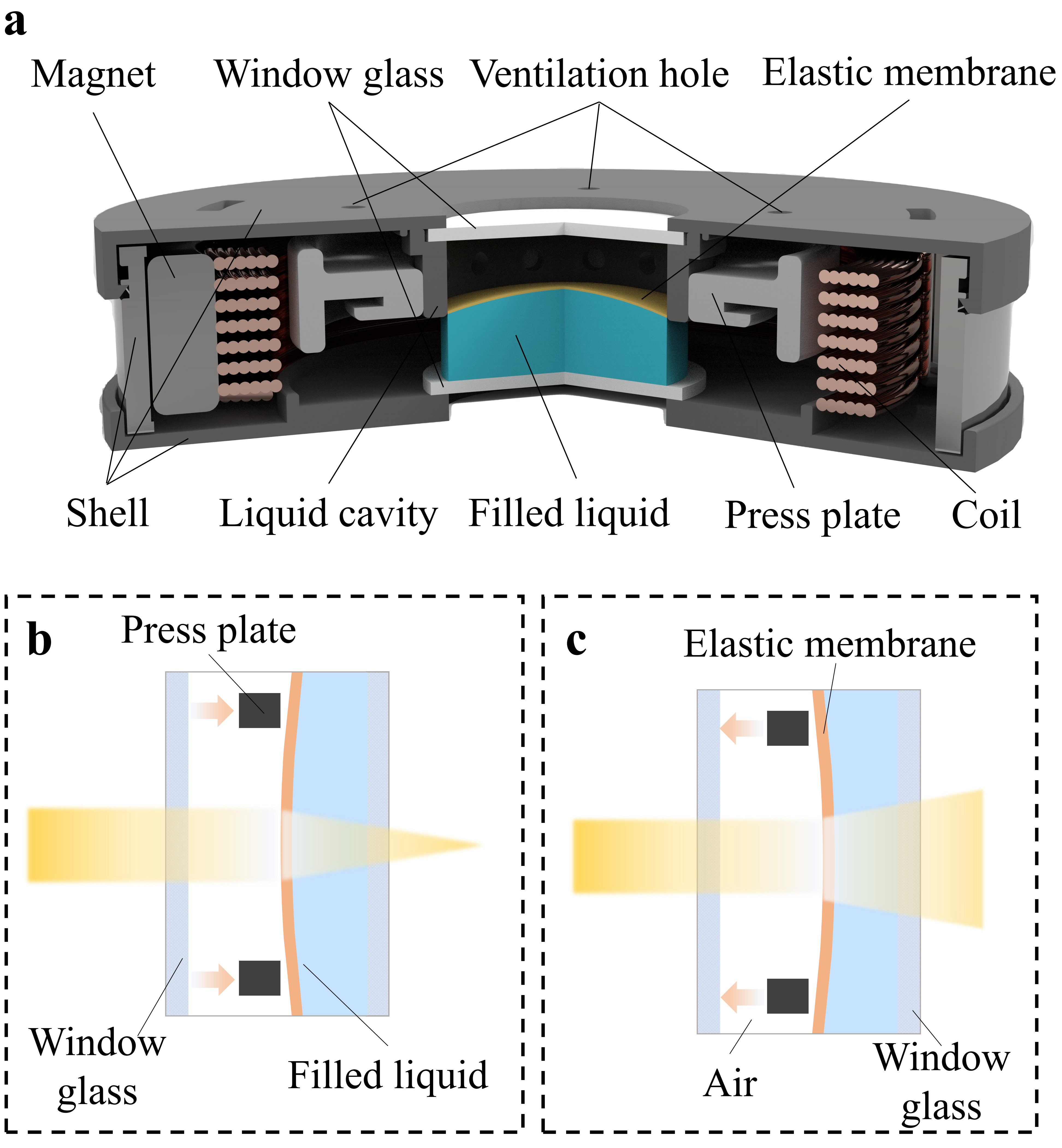 Figure 2 Structure and function of the elastic membrane liquid lens.