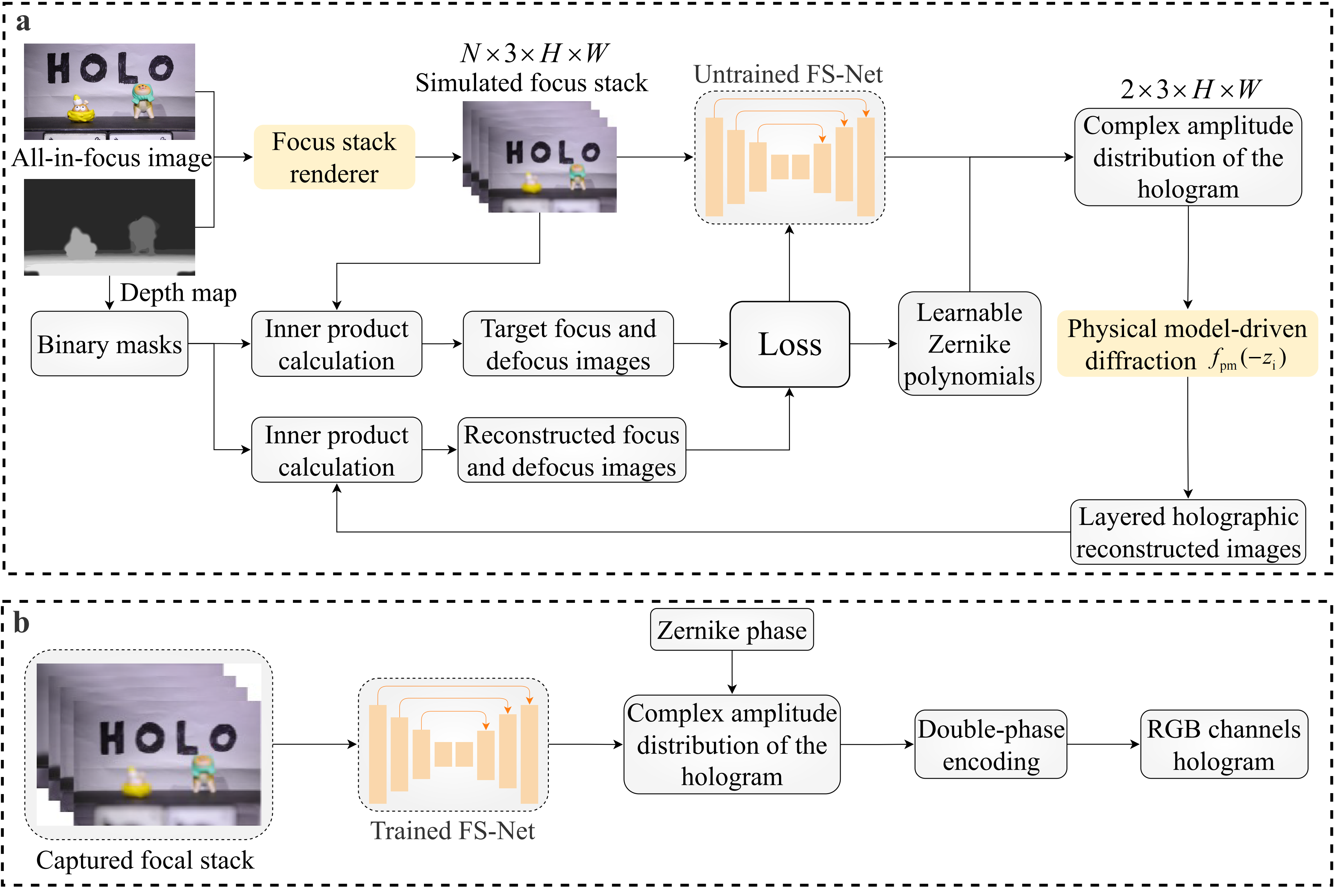 Figure 3 shows the flow of training and generating holograms based on the FS-Net. We take the focus stack of the real 3D scene as the input to FS-Net, and then introduce the focus stack renderer and learnable Zernike polynomials in the hologram training process. Firstly, we process the all-in-focus image and depth map of the real 3D scene into the focus stack using the focus stack renderer. Next, the complex amplitude distribution of the focus stack is output using the untrained FS-Net. Then, the complex amplitude distribution is back-propagated using a physical diffraction model to obtain the layered holographic reconstructed images. Subsequently, several binary masks are calculated based on the number of layers and the depth map, and the inner products of the binary masks with the focus stack and the layered holographic reconstructed images are calculated, respectively, which in turn yield the target focus and defocus images, and the reconstructed focus and defocus images. Finally, the loss function between the target focus and defocus images and the reconstructed focus and defocus images are calculated and the parameters in the learnable Zernike polynomials and FS-Net are optimized. The above steps are repeated and the training of the FS-Net stops when the network iterates to a fixed number of rounds. We input the focus stack captured by the liquid camera into the trained FS-Net to obtain the complex amplitude distribution of the focus stack. After compensating for complex amplitude distribution using the Zernike phase, a high-fidelity hologram of the focus stack can be obtained using the double-phase encoding method.