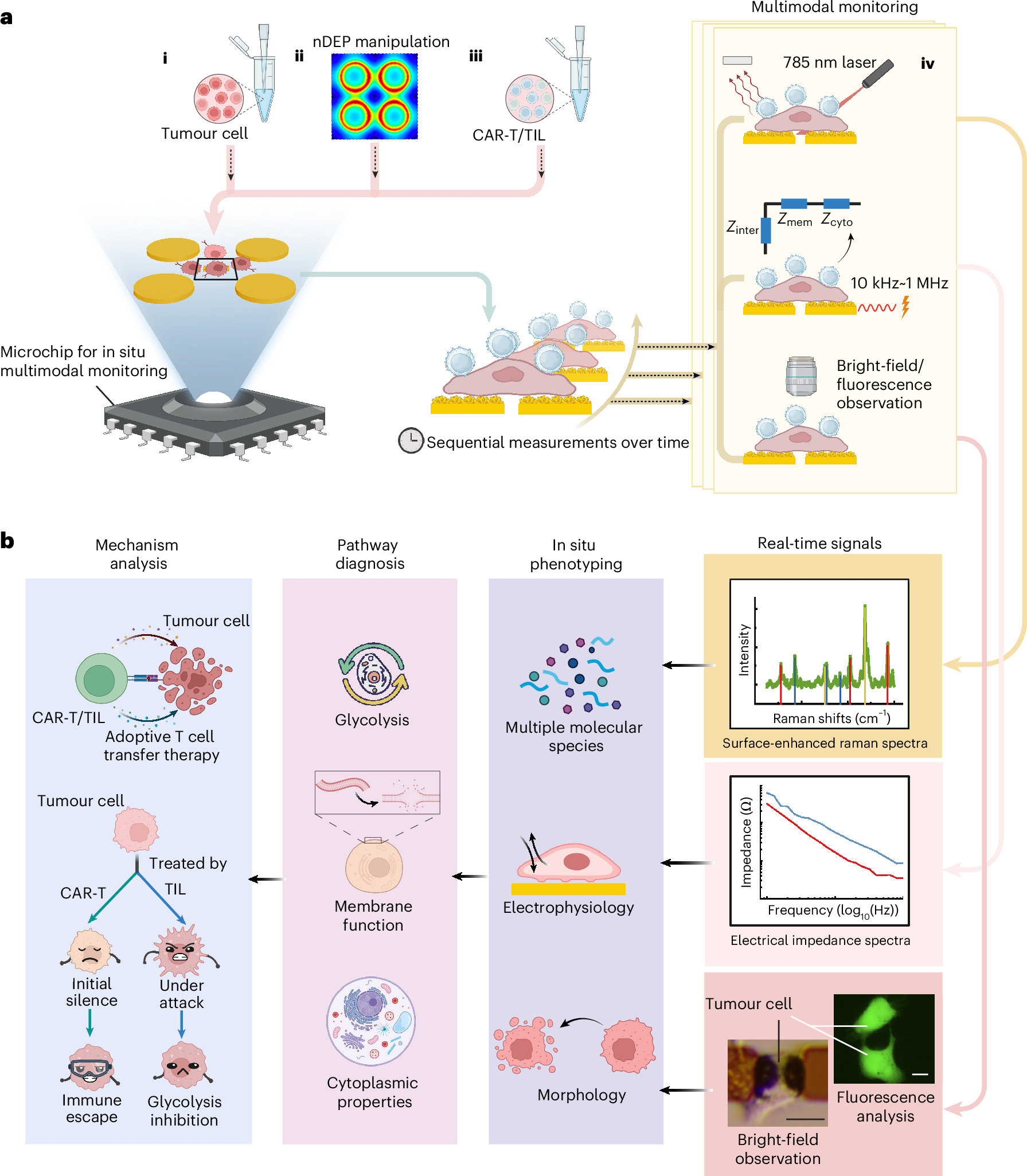 Figure. 1 | Schematic diagram of multimodal phenotyping system. a. Flow chart of multimodal phenotyping. (i) Tumor cells are seeded on a microchip. (ii)Negative dielectrophoretic manipulation is applied to trap the tumor cells onto the center probes. (iii)After cell adhesion, adoptive T cells at a ratio of T: cancer cell 4: 1 are added. (iv)Multimodal single-cell phenotyping is conducted on live tumor cells in real-time. b. Schematic of multimodal phenotypic analysis. Real-time signals of surface-enhanced Raman spectra (SERS), electrical impedance spectra (EIS), bright-field images as well as fluorescence images of single tumor cell (scale bar is 20 ) are acquired at sensing layer, from which the multiple molecular species, electrophysiological properties, and morphologies of target tumor cell are figured out. The multimodal phenotypes are utilized to diagnose the key molecular events of glycolysis, membrane and cytoplasm, further reflecting the mechanism of such as killing process and immune escape for tumor cells when attacked by ACT cells. This figure is created with BioRender.com.