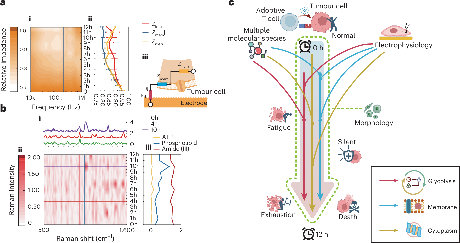 Figure. 2 | Real-time multimodal phenotyping of live single cells. a. Real-time electrical impedance spectra of single tumor cell under CAR-T treatment. (i) Normalized electrical impedance spectra contour profile. The color bar represents normalized intensity in arbitrary units (a.u.). (ii) The time-varying single-cellular impedance signals characterizing key cellular electrophysiological status. (iii) Schematic of equivalent circuit model of adherent single cell measured by microelectrodes. b. Real-time Raman spectra of single tumor cell under TIL treatment. (i) Raman spectra at the therapy time points (0h, 4h, 10h). (ii) Normalized Raman spectra contour profile. (iii) The time-varying Raman signals characterizing typical molecules (ATP, phospholipid, amide (III)). c. Schematic of dynamic tumor cytopathology monitoring through multimodal phenotyping during ACT therapy. Elements in Figures 2a and 2c are created with BioRender.com.