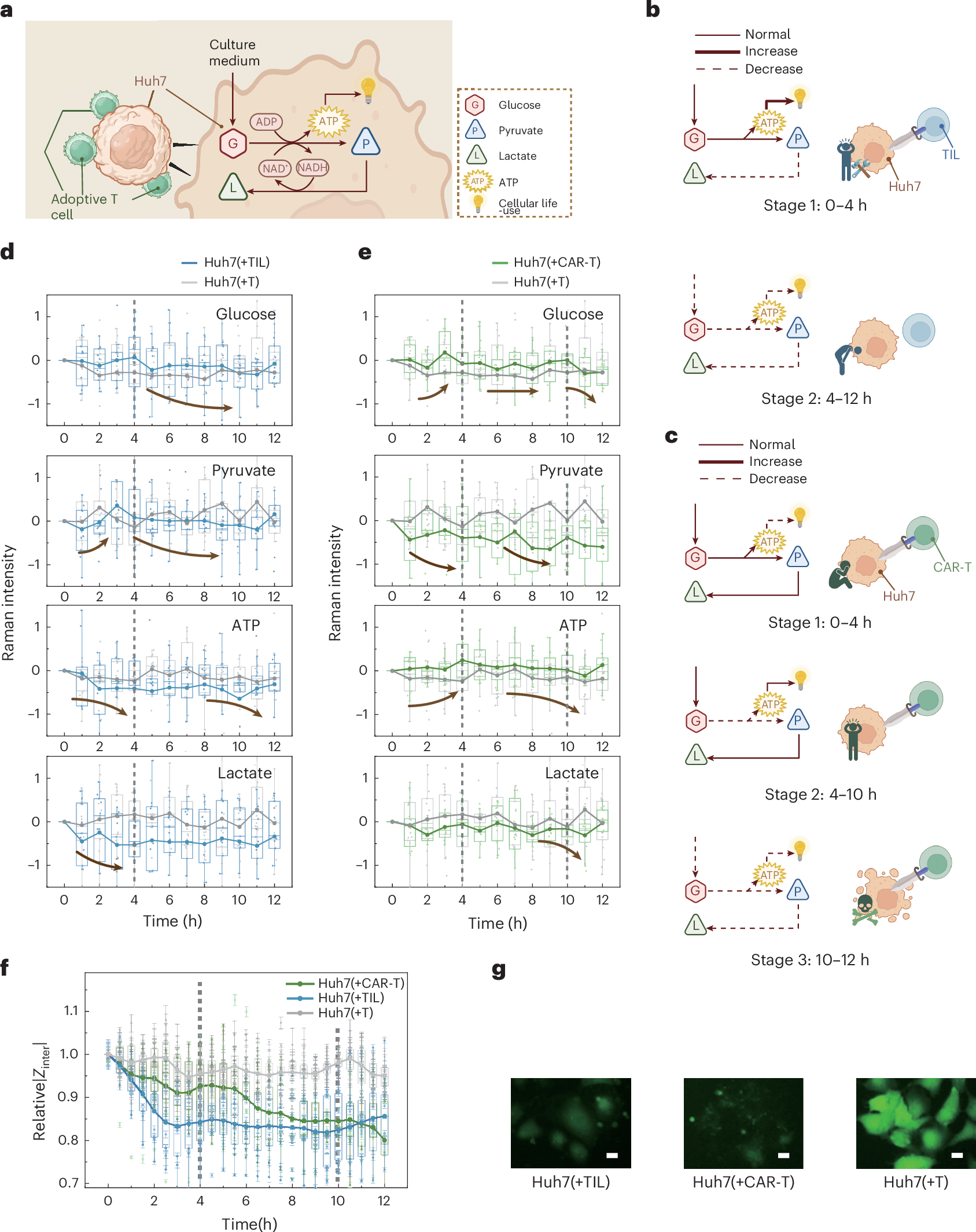 Figure. 3 | Dynamic divergence in Huh7 glycolysis treated by TIL and CAR-T reveal immune escape and killing mechanism. a. Flow diagram of glycolysis in Huh7. b. Flow diagram of TIL effective stages. c. Flow diagram of CAR-T effective stages. d. Dynamic molecular responses of Huh7 treated by TIL (n=11). e. Dynamic molecular responses of Huh7 treated by CAR-T (n=10). The light grey curves in Figures 3d and 3e are dynamic molecular responses of Huh7 treated by normal T cells as control group (n=14). f. Interface impedance changes of Huh7 treated by different T cells. g. Calcein-AM fluorescence staining results of Huh7 after 12h treatment, scale bar is 20 . Each representative image shows the results consistently observed in three independent experiments. Scatterplots in d–f represent individual cell samples, error bars in f were calculated from 3 consecutive measurements on the cell and represent s.d. Boxplots show cell sample statistics; boxplots in d–f show median (centre line), upper and lower quartiles (box limits) and 1.5× the interquartile range (whiskers). The line plots connect the mean values of the boxes under the same treatments. The brown arrows in d–e indicate the trend of molecular or chemical bonds changes, and the grey dashed lines in d-f represent the division of time periods.Elements in a-c are created with BioRender.com.