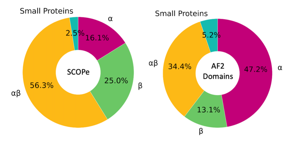 We used 3D-AF-Surfer to analyze the distribution of the protein folds of Alphafold2 models. Figure 2 shows the distribution of the fold (secondary structure) classes of the Alphafold2 models (the right panel) in comparison with the SCOPe protein structure classification database, which includes protein structures determined by experiments (the left panel). Interestingly, our results showed that the alpha helix class dominates the distribution with over 47% of the structural domains classified as the alpha class. This result contrasts with the distribution observed in experimentally solved structured wherein the alpha/beta class is expected to dominate. We also analyzed unconfident regions of Alphafold2 models in comparison with disordered region prediction from protein sequence. The result showed that at most only 30 to 50%, of unconfident regions correspond to disordered regions, which implies that the rest of the regions would be folded in the native structures. The analysis highlights potential difference of the Alphafold2 models with the native structures, which are yet to be solved.