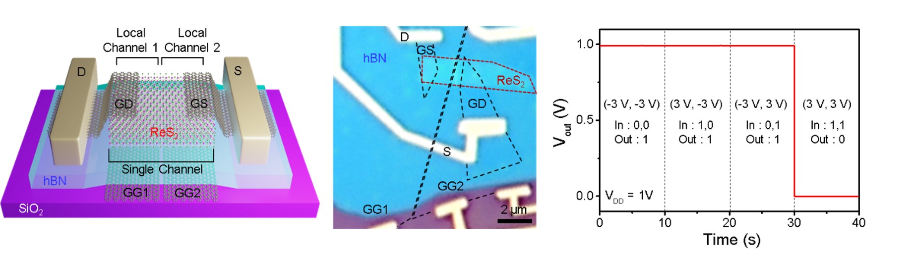 3D Sketch and optical image of our “all-2D” logic device realized in a single ReS2 channel. (Left and middle, respectively) This device shows reliable operation as a NAND gate logic. (Right)