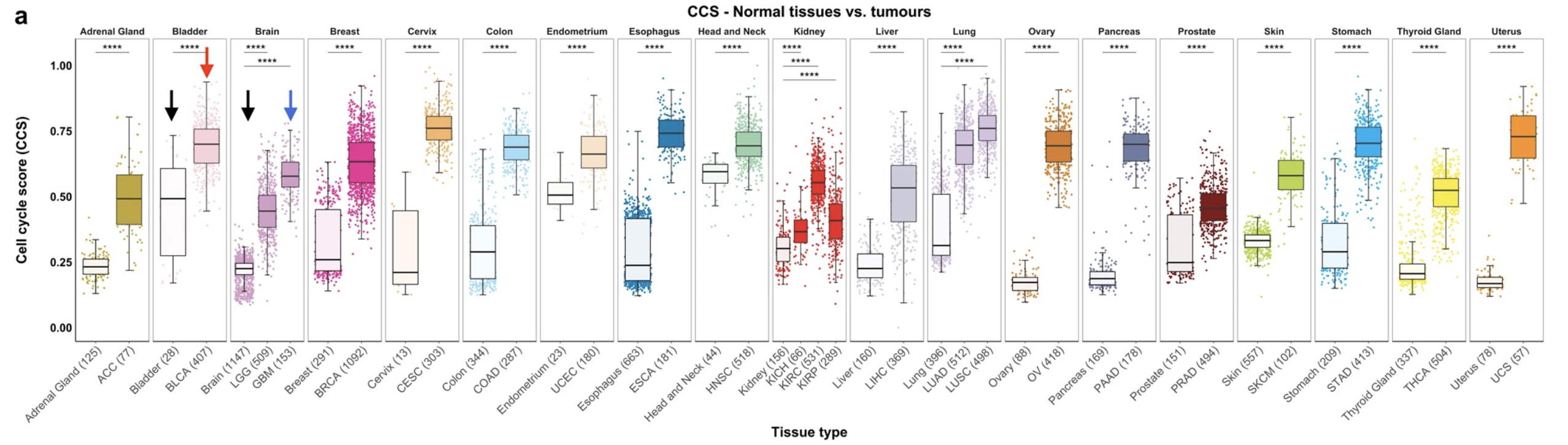 The arrows in the above image highlight the entire reason for performing this study, here's how we describe it in the paper: "Bladder cancer (“BLCA”, red arrow) has higher cell cycle activity than glioblastoma multiforme (“GBM”, blue arrow), but normal levels of bladder cell cycle activity are much higher than that of brain tissue (compare “Bladder” to “Brain”, black arrows). This means that at the absolute level BLCA shows higher cell cycle activity levels than GBM, but at a relative level (relative to its baseline level in normal tissue) GBM’s cell cycle activity is much higher than BLCA."