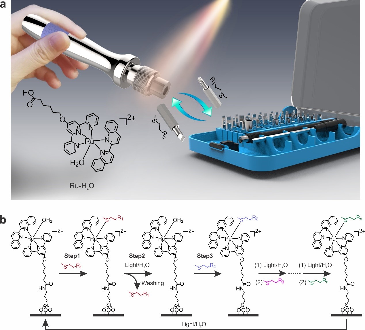 Two years ago, my institute was under construction. When I walked through the constructed hallway, I was disturbed by the noise from an electric screwdriver. As my group was working on photoresponsive Ru complexes, I noticed that Ru complexes may act as molecular screwdrivers that are a hundred million times smaller than the real one. Molecular screwdrivers may be used to construct nano world. Inspired by the screwdriver, we designed a Ru complex (Ru-H2O), which acts as the molecular “screwdriver”, and thioethers with different functional groups act as molecular “bits”. The removal of the bit on the screwdriver is driven by visible light, while the attachment of another bit to the screwdriver is achieved in the dark via thermal substitution. Based on the reversible ligand substitution, we constructed surfaces that can be reconfigured into user-defined functions.