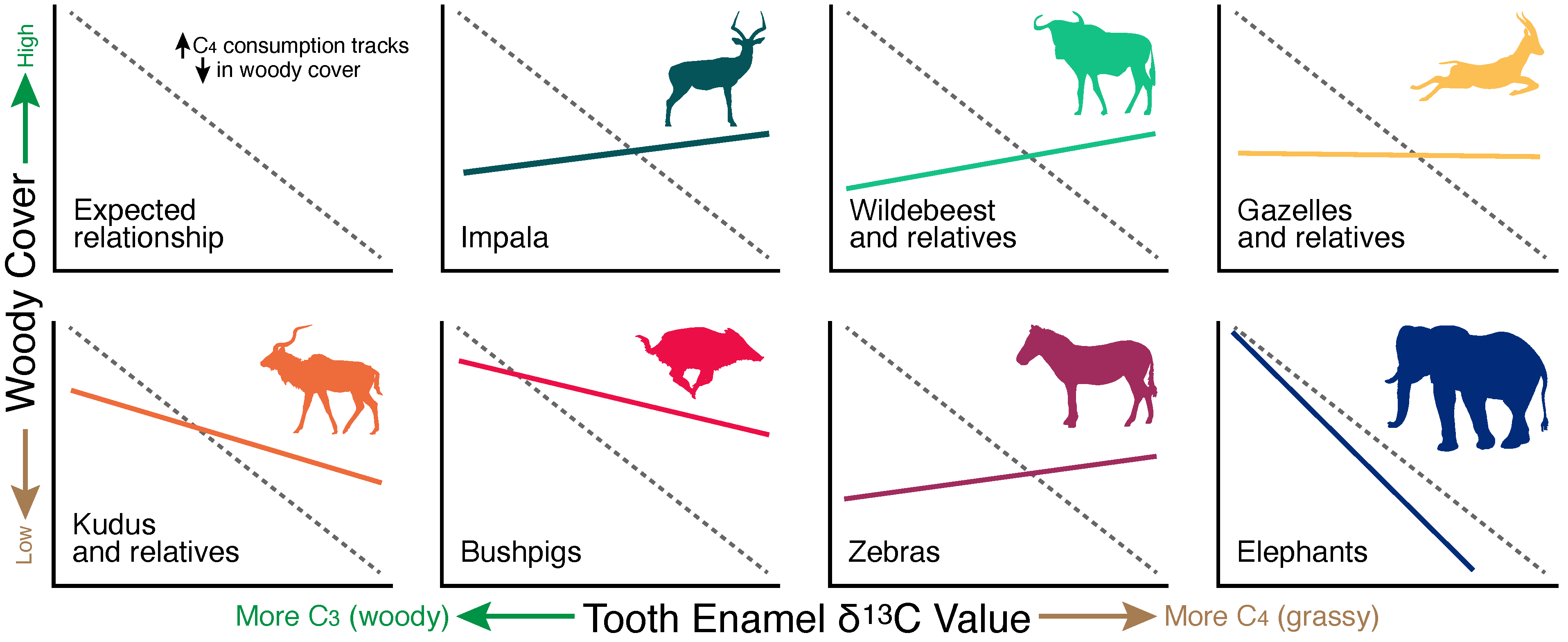 After discussions with my colleagues John Rowan from the University at Albany, Andrew Barr from the George Washington University, and Matt Sponheimer from the University of Colorado Boulder, a few things started to bother us. Key among these was our suspicion that herbivore diets might not closely track the proportion of different vegetation types in the ecosystems, which means they would be of little use for making vegetation inferences in the fossil record. Our suspicion was supported as we dug into the modern ecological literature, but there was no comprehensive analysis of how herbivore diets varied across multiple ecosystems. Our research question had emerged: do herbivore diets, as interpreted from carbon stable isotopes, actually reflect variation in vegetation structure across ecosystems? This is a fundamental assumption that many hominin paleoecologists make when generating paleoenvironmental reconstructions. We specifically focused on woody cover, as this aspect of vegetation structure has been central to hypotheses of hominin evolution for decades.