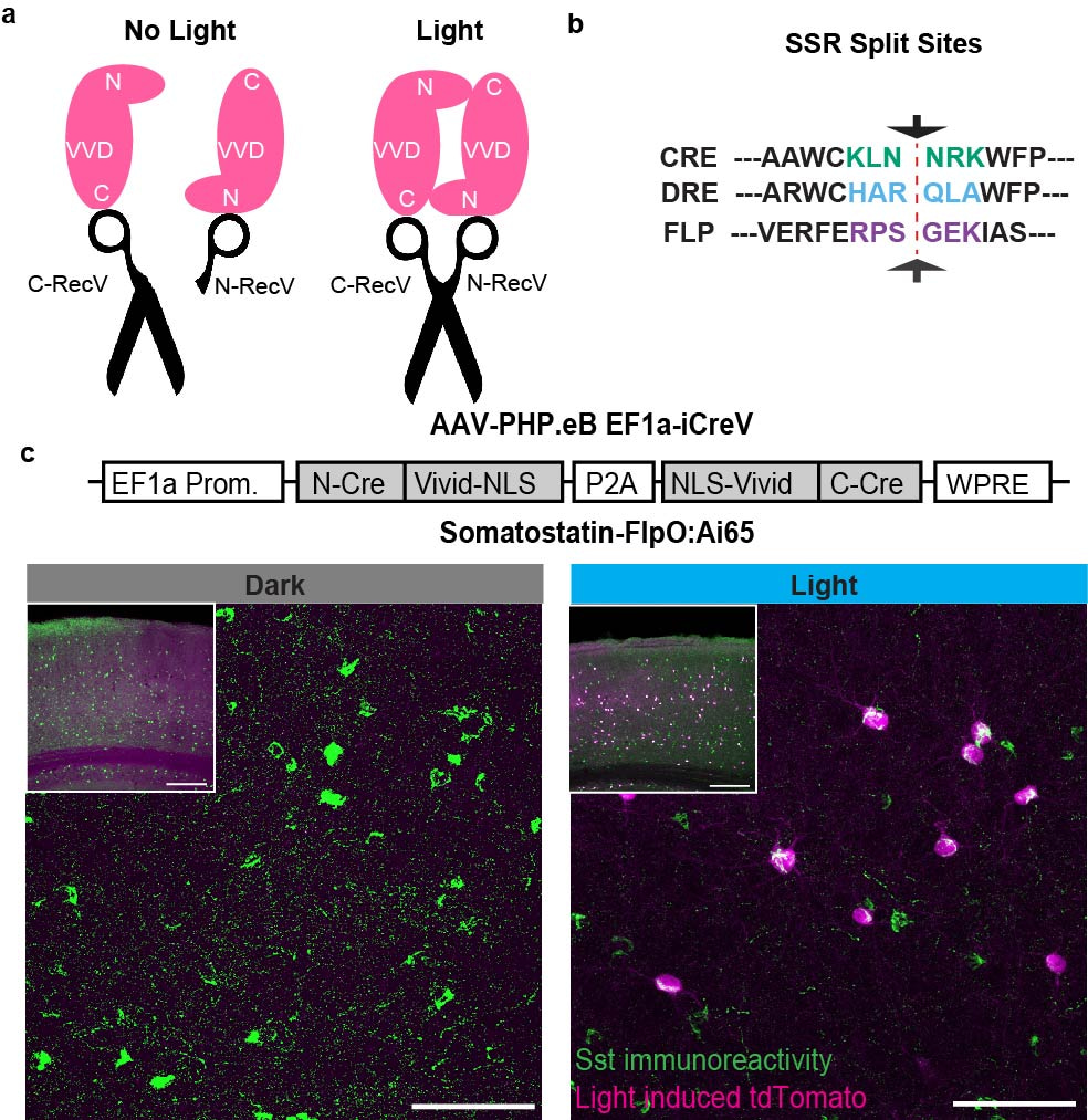 Figure 1. Design and application of the RecVs. a, Schematic of the RecV system. b, Alignment of amino-acid sequences of Cre, Dre and Flp recombinases with split sites noted by arrows. c, Schematic of the RecV rAAV construct. Somatostatin FlpO mouse line, Sst-IRES-FlpO, crossed with a Cre/Flp double-dependent tdTomato reporter mouse line, Ai65, was retro-orbitally injected with AAV-PHP.eB EF1a-iCreV and light was delivered to the left hemisphere. We observed recombination in somatostatin-positive inhibitory interneurons at the hemisphere that received light induction as revealed by immunohistochemistry (100% of reporter positive cells (119) were Sst positive (313); 38.1% of Sst cells were reporter positive).