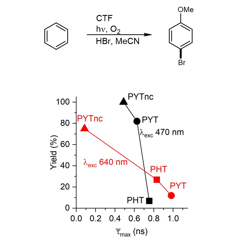 More important, the lifetime of such excited state is potentially long enough to engage in electron transfer, a redox process. Therefore, we concluded that REE may be applied in chromoselective photocatalysis. To verify this idea, we have chosen two reactions – oxidative bromination of aromatic compounds and dual Ni-photocatalytic C-N cross coupling. REE has important implications in these examples. In the first reaction, the yield of 4-bromoanisole obtained upon illumination at specific wavelength correlates with the fluorescence lifetime determined upon CTF excitation at the same wavelength.