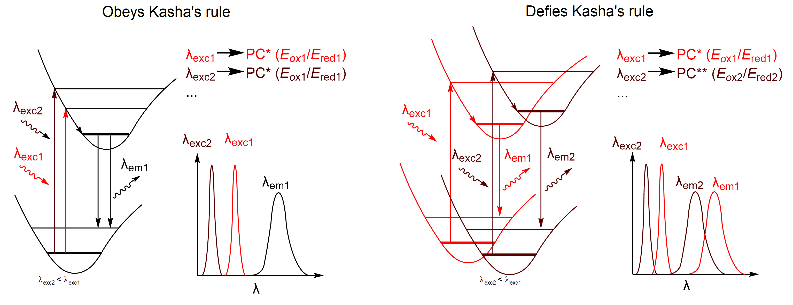 Therefore, the CTFs defy Kasha’s rule, according to which emission of a photon occurs only from the lowest excited state or vibrational sub-level. In other words, by selecting suitable photons we are able to generate CTF excited state of specific energy.