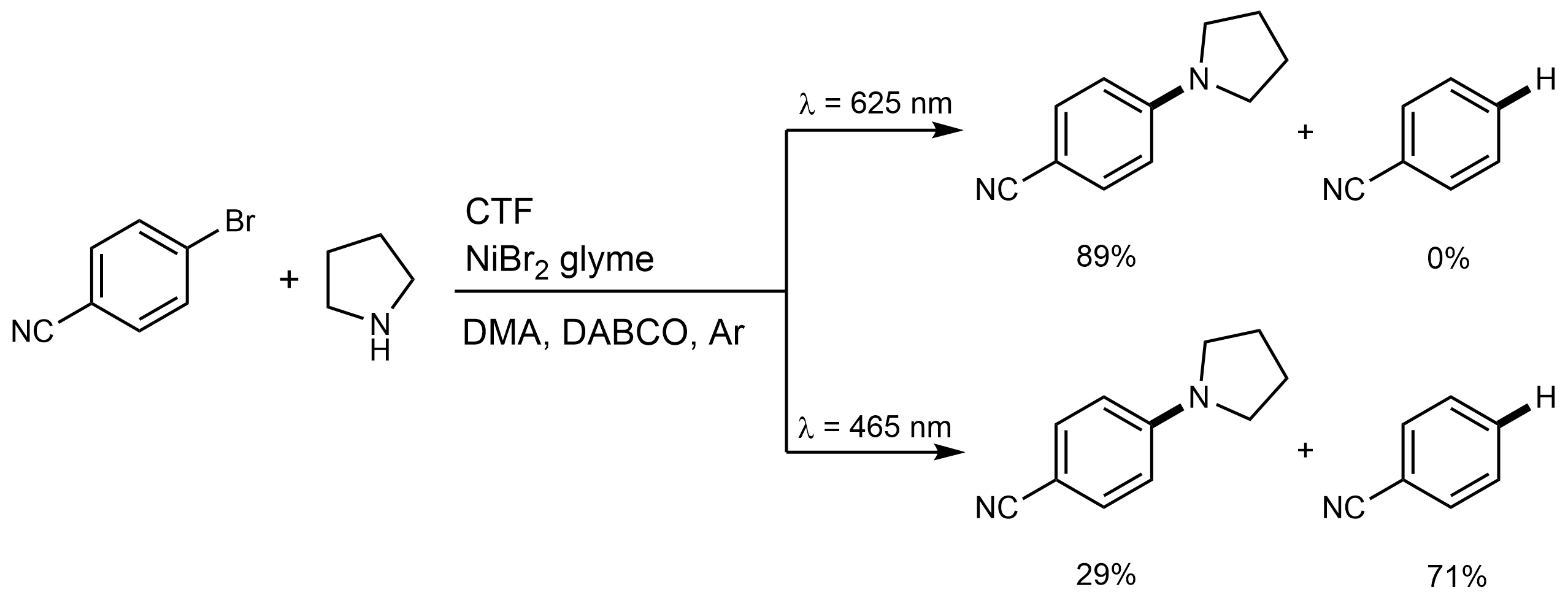 In the second reaction, we completely suppressed the undesirable dehalogenation of 4-cyanobromobenzene, which was the primary pathway under blue light, by employing photons on the edge of visible spectrum.