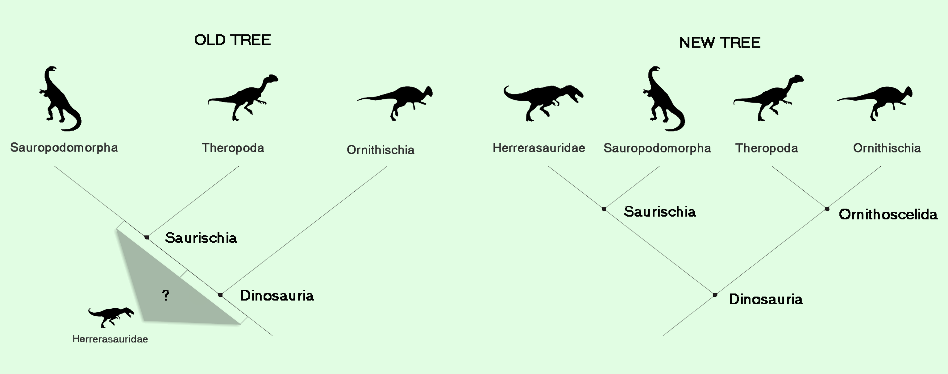 Old vs. New: A summation of previous hypotheses, with the position of the enigmatic Herrerasauridae causing a fair bit of debate (left) and our new hypothesis (right). The former appears in every kids book on dinosaurs, every museum display and every undergraduate geology Paleo101 course handout; the latter might need to be substituted in if our hypothesis gains acceptance among vertebrate palaeontologists.