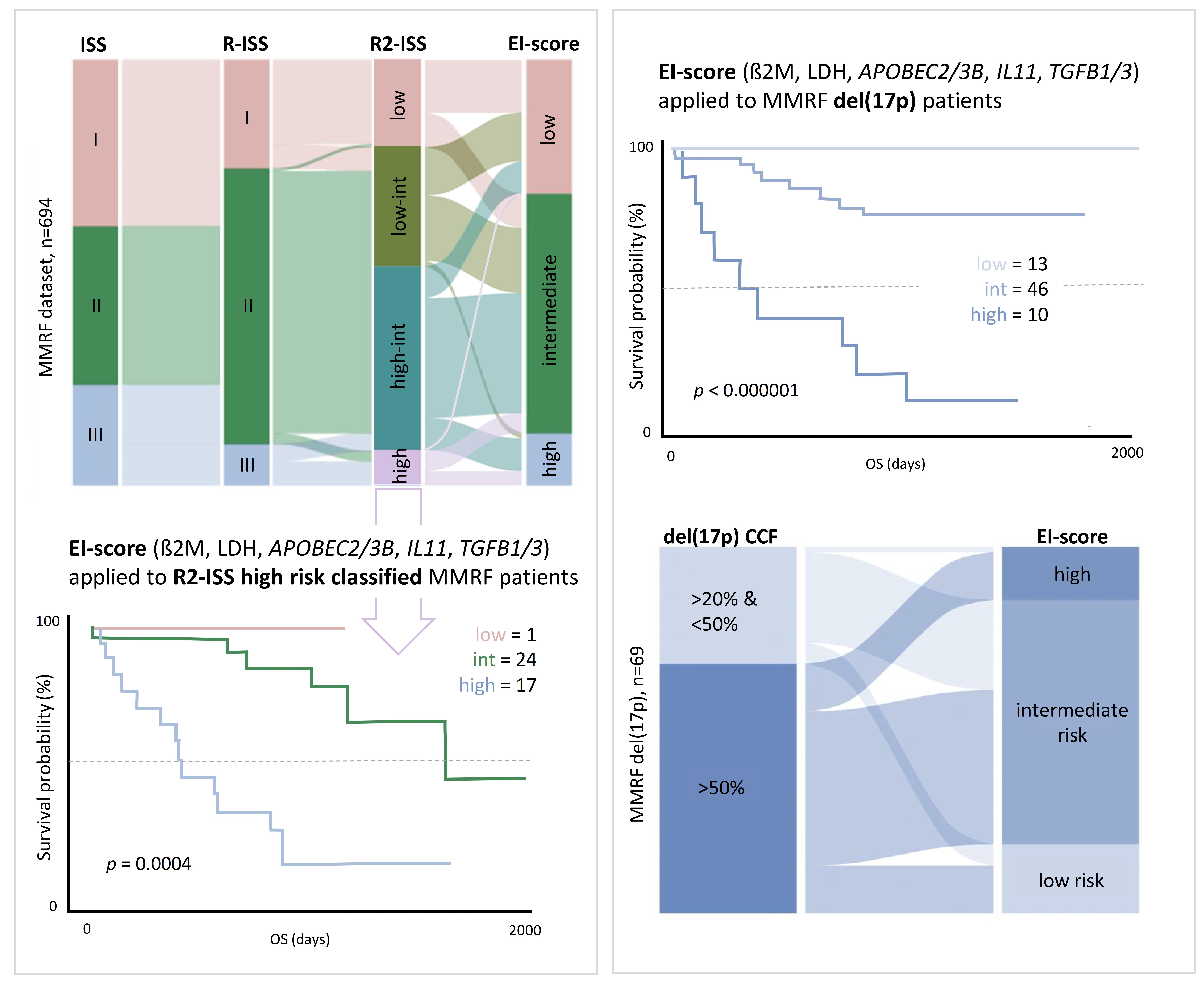 Furthermore, the study revealed that MM patients with high-risk cytogenetic features (e.g., del(17p), t(4;14), and +1q) could be reclassified into different risk categories based on their EI score, suggesting a more nuanced understanding of risk in the context of molecular and genetic factors. This reclassification has potential implications for treatment planning and prognostication, indicating that patients previously deemed high-risk may have a more favorable prognosis than assumed when molecular markers are considered.