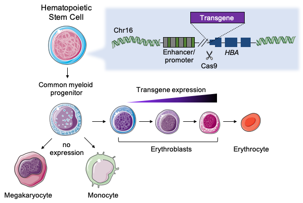 To maximize protein expression, we had to find a highly transcribed – but somewhat disposable- gene that was present in an abundant hematopoietic cell lineage. α-globin genes were the answer, as they are highly expressed (~1.5g/day) by erythroid cells, and the loss of up to 3 out of 4 α-globin alleles is mostly asymptomatic. As a single erythroid progenitor can produce more than 106 erythroblasts, we hypothesized that the combination of robust transcription and the abundance of transgene-expressing cells would boost protein production, even with few integrations in HSCs.