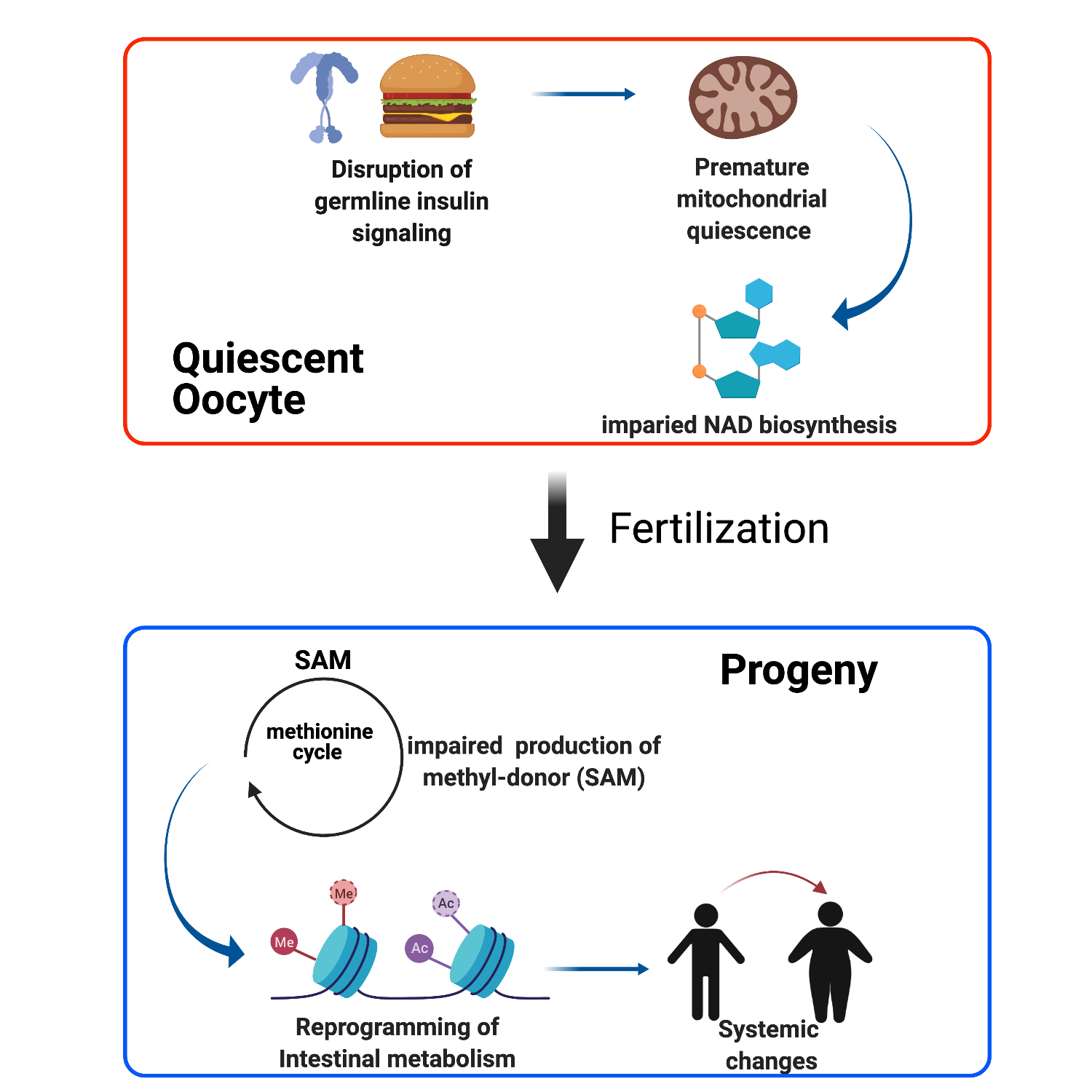 Our previous work has shown that germline mitochondrial metabolism is regulated by maternal diet. This led us to that hypothesize that alterations in germ cell metabolism may drive some of these heritable effects on progeny metabolism and forms the basis for our publication Hocaoglu et al Nature Metabolism 2021. When we examined metabolism during normal oocyte development and found that as follicles transition into the dormant state of cellular quiescence mitochondrial function is suppressed in a process we call mitochondrial respiratory quiescence (MRQ). During MRQ several pathways that maintain NAD/NADH redox homeostasis are inactivated and oocyte acquire a unique composition of redox metabolites. Interestingly, inhibition of insulin signaling in germ cells causes MRQ to occur prematurely in oocyte development and these eggs display reduced levels of NAD+. Moreover, the resulting progeny produced by these females display a reprogramming of progeny metabolism that leads to elevated mitochondria activity and life-long changes in triglyceride and carbohydrate levels. Interestingly these transgenerational phenotypes could be rescued by feeding mothers NAD+ precursors which shows that oocyte NAD+ levels drive the reprogramming of progeny metabolism.
