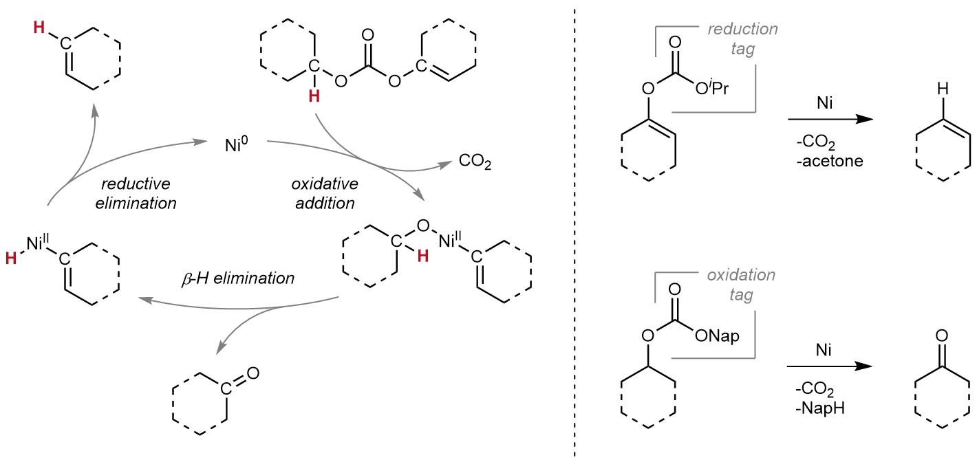 Intrigued by this purely catalytic reactivity profile, I set out to build upon these fundamental studies and wondered whether the strategic utilization of a single functional group, which would facilitate reductive as well as oxidative hydride transpositions in a unified manner, could give rise to a general principle for performing mild and selective redox transformations of C–O bonds in the absence of external redox agents, especially targeting the challenging hydrogenolysis of C(sp2)–O bonds. As a result of this design principle, the preinstalled functional group would serve as a redox tag – a synthetic handle dictating the desired redox reactivity of the C–O bond while also allowing for the differentiation between C–O bonds.