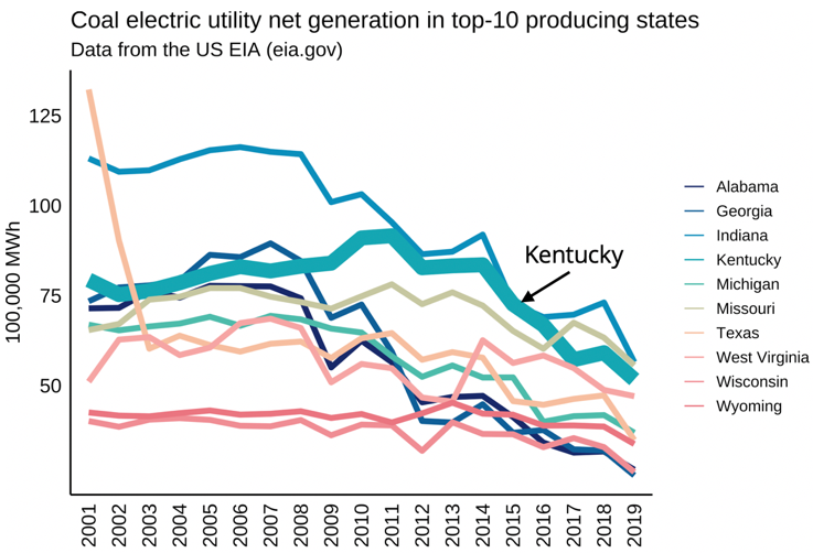 At a retirement party, Meredith had described to me Propeller’s Air Louisville program, which supplied digital medication sensors to Louisville, Kentucky residents with asthma, which allowed Propeller to track the location and time of participants’ rescue inhaler use. I immediately thought about Kentucky’s coal electricity generation and found that the state was the #3 producer of coal-generated electricity in the U.S. in 2018, with steep declines from 2013–2017.