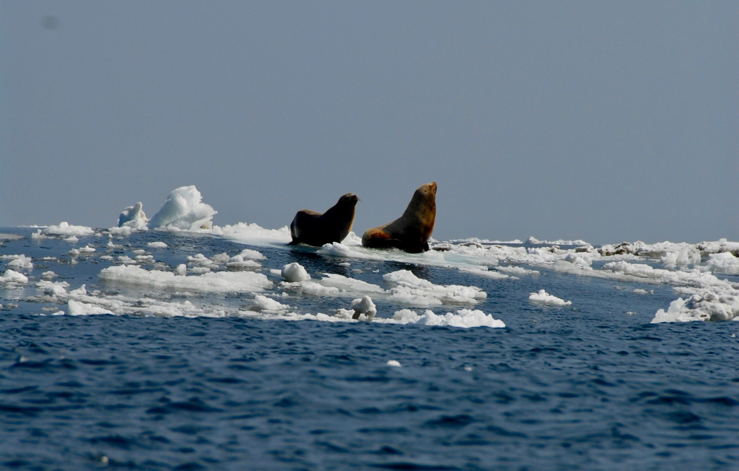 Steller sea lions surfing the ice in the North Pacific Ocean. Photo by Josh London, NOAA Fisheries, Polar Ecosystems Program, AFSC.