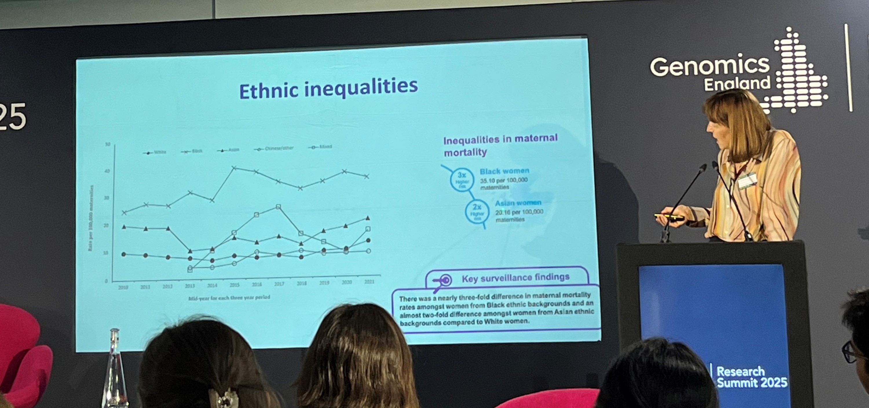 In her presentation “Pregnancy Disorders and Ethnic Diversity: Returning Results,” Professor Catherine Williamson highlighted that pregnancy disorders (such as gestational diabetes, pre-eclampsia and pre-term birth) disproportionately affect Black and ethnic minority women. She also reiterated the statistic that Black women are three times more likely to die from pregnancy-related complications. In a related presentation, Dr. Chelala shared findings from her recent Nature Communications publication, “The Clinical and Molecular Landscape of Breast Cancer in Women of African and South Asian Ancestry,” which revealed that non-European breast cancer patients are often diagnosed at a younger age and face higher mortality rates.