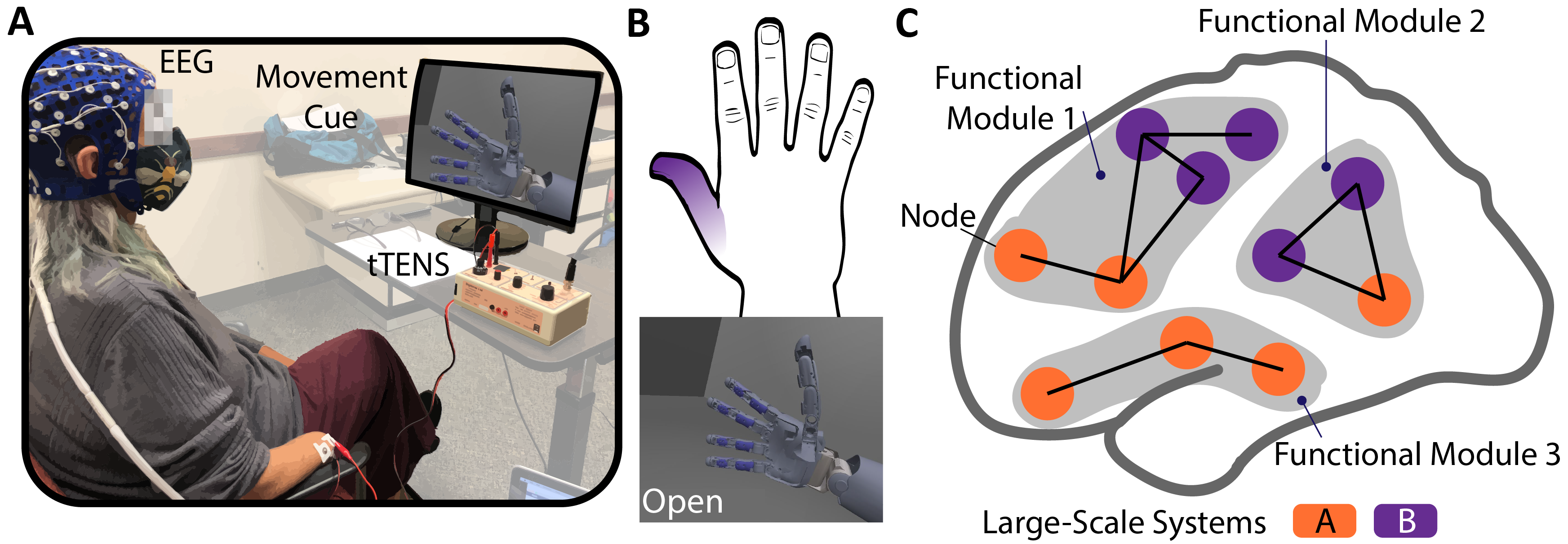 Figure 1. (A) Experimental setup. (B) xample of phantom hand sensation and grasp association identified by one participant. (C) Schematic of the large-scale systems and the functional modules.