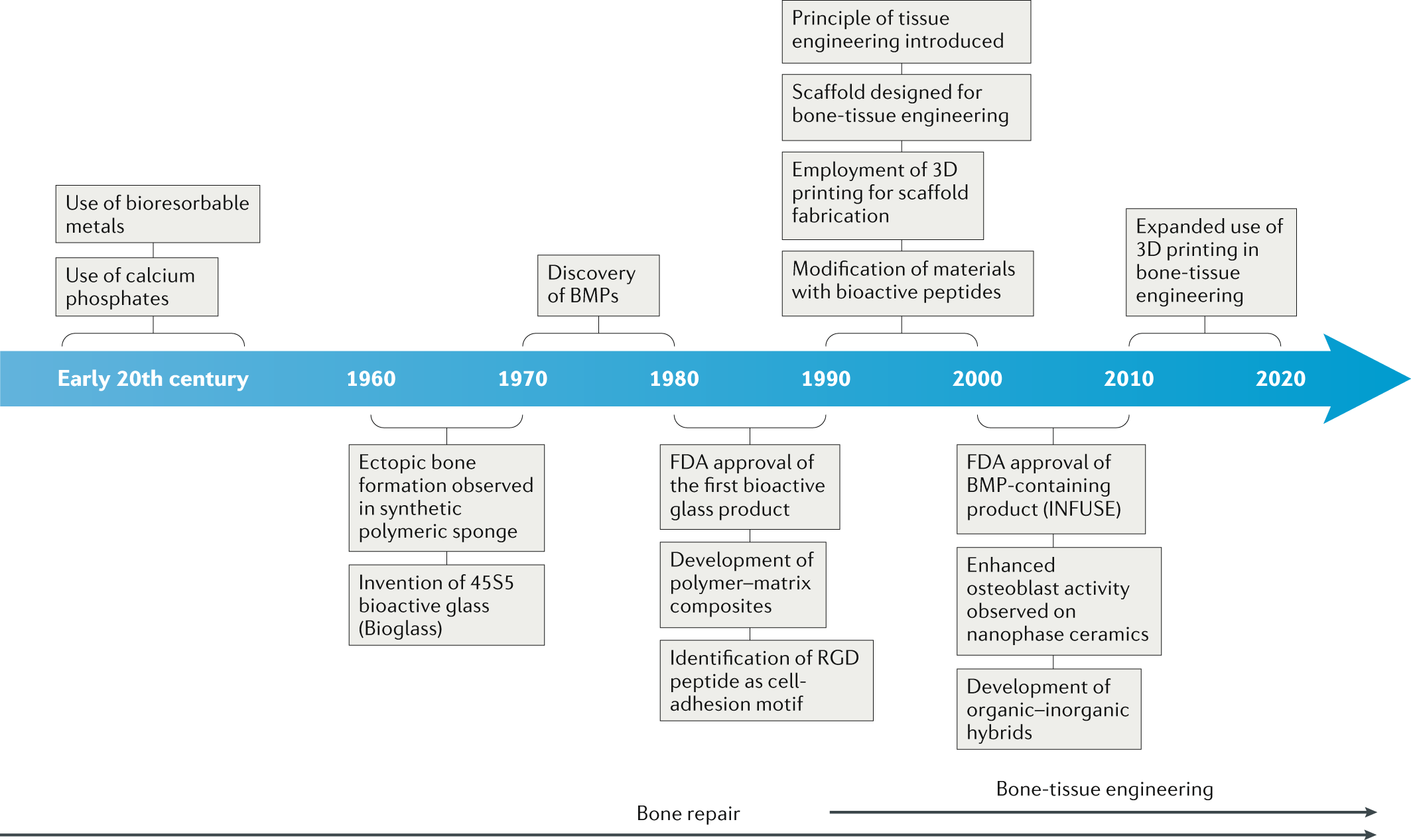 This niche, is however, not new; the first reports go back to the nineteenth century, when surgeons investigated the use of calcium phosphate as bone grafts [Dorozkhin 2013] (Figure 5). Implants have since evolved with advances in materials synthesis and processing, alongside an improved understanding of bone biology and structure [Koons 2020]. The field of bone tissue engineering research can design materials with synthetic and native constructs to outperform the existing gold standard of autografts and allografts [Bhumiratana 2016].