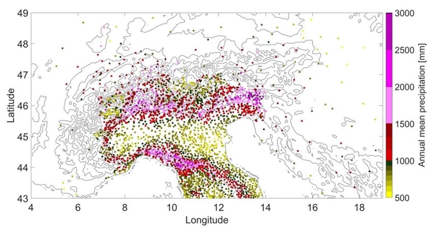 Fig. 2: Stations of the high density database used in the study and relative annual mean precipitation.